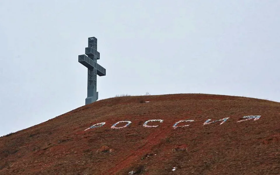 Немного подумав, убрали из-под креста давнюю, нанесенную прямо на землю надпись «Россия», поскольку крест, задуманный как поклонный, выглядел на невысокой горке, подписанной как «Россия», крестом могильным. Ночью он светится.