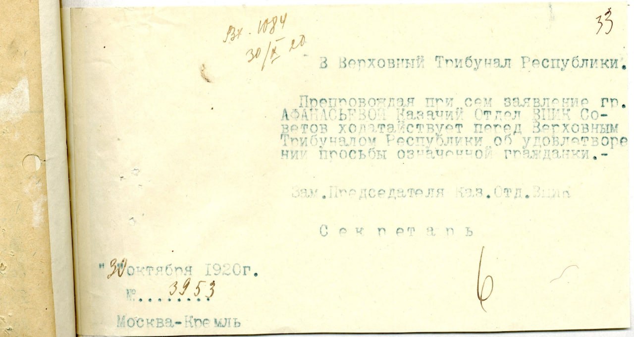 Казачий отдел ВЦИК — особая структура при центральной большевистской власти, которая отвечала за взаимодействие с казаками и работу на традиционных казачьих землях, — 30 октября 1920 года ходатайствовал перед Верховным трибуналом республики удовлетворить поступившую в Москву просьбу гражданки Афанасьевой. Одним из направлений работы отдела было посредничество между казаками и разными советскими органами по самым различным поводам. Это могла быть просьба на получение какого-нибудь пособия или пайка, отпуск канцелярских принадлежностей местным учреждениям (в условиях военного коммунизма и глубокой разрухи такие вопросы также необходимо было решать через Москву), однако приходилось – и, вероятно, нередко — работать и с просьбами, подобным тем, что поступила от гражданки Афанасьевой. Она просила выдать ей тело расстрелянного мужа.