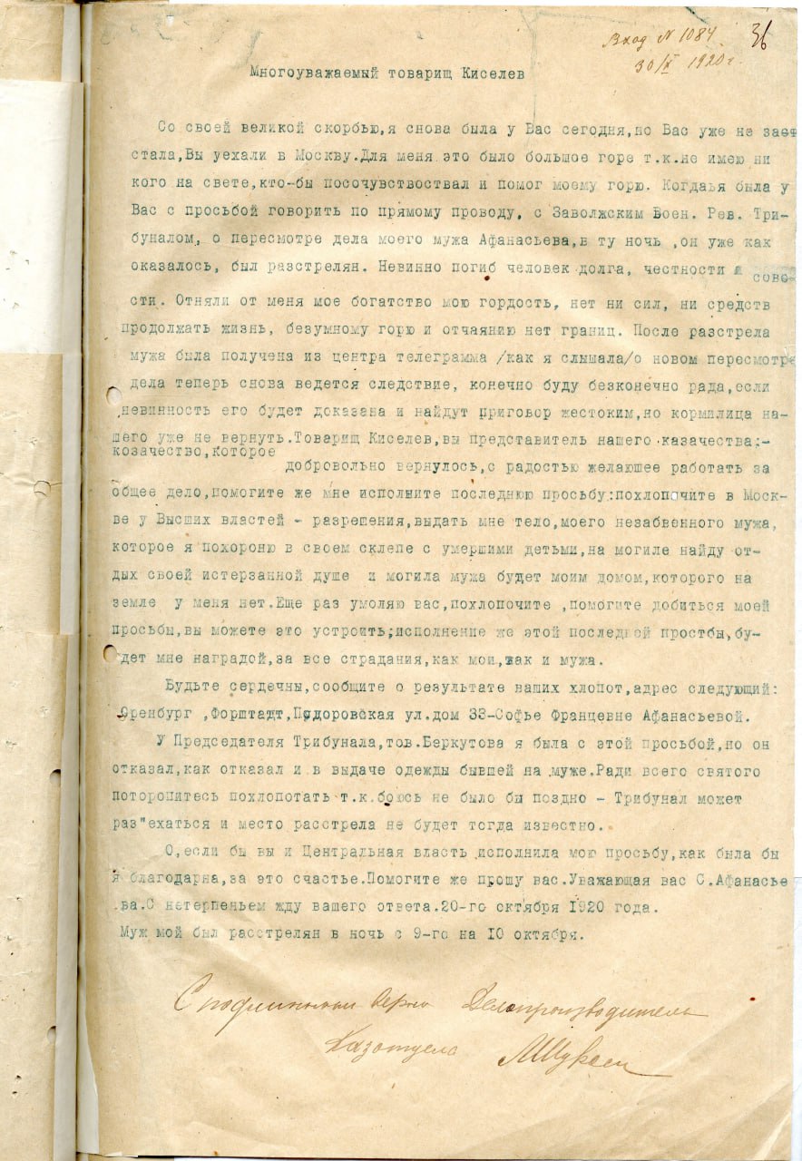 Эта просьба также хранится в архиве и дает понять, каким языком приходилось разговаривать с официальными органами о подобных трагедиях. Афанасьева пишет свое письмо некоему Киселеву — представителю Казачьего отдела ВЦИК, командированному в Оренбург. Для нее он представляется хоть каким-то защитником, поэтому она может позволить себе традиционные проявления горя: «Невинно погиб человек долга, честности и совести. Отняли от меня мое богатство, мою гордость, нет ни сил, ни средств продолжать жизнь, безумному горю и отчаянию нет границ». Как можно понять из письма, Киселев действительно по каким-то причинам хотел разобраться в деле Афанасьева и имел на это определенные полномочия. Вдова упоминает, что она обращалась к нему с просьбой поговорить по прямому проводу с Заволжским революционным трибуналом, который решал судьбу арестованного Афанасьева, но, как оказалось, к тому времени ее муж уже был расстрелян — по-видимому, и такие ситуации, когда вовремя состоявшийся разговор одного советского начальника с другим по работающей телефонной линии мог решить чью-то судьбу, не были в то время редкими. Тем более что по поводу уже решенной участи казака Афанасьева возникли какие-то разногласия в советских инстанциях, и вдова упоминает о том, что «из центра получена телеграма» и дело, возможно, пересмотрят «но кормильца нашего уже не вернуть». Афанасьева пишет в письме уже уехавшему в Москву Киселеву: «Похлопочите в Москве у Высших властей разрешения выдать мне тело моего незабвенного мужа, которого я похороню в своем склепе с умершими детьми, на могиле найду отдых моей истерзанной душе».