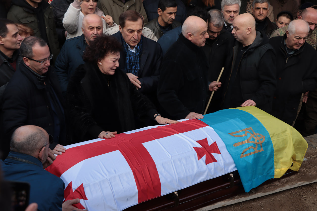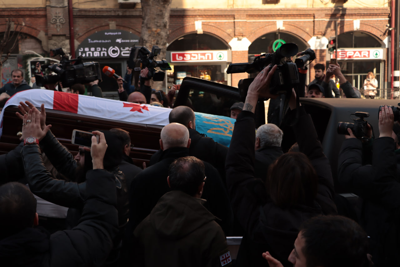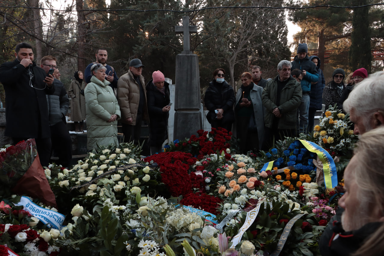 После прощальной церемонии гроб вынесли под аплодисменты сотен собравшихся на улице жителей Тбилиси. Люди отправились вслед за катафалком на Верийское кладбище, где артиста по его собственной просьбе, похоронили рядом с могилой матери. На церемонии присутствовали знаменитые артисты, а также ветераны Грузинского легиона, который воюет в Украине.[fancy_gallery gallery=0]