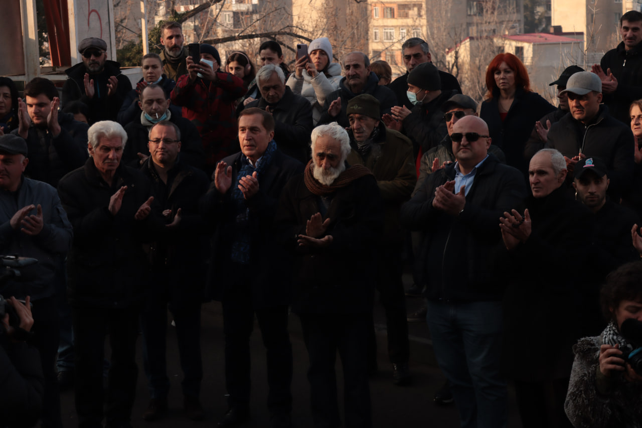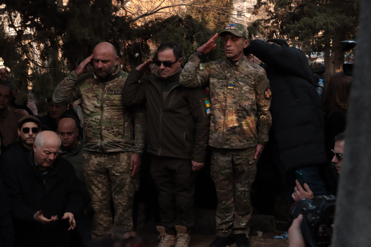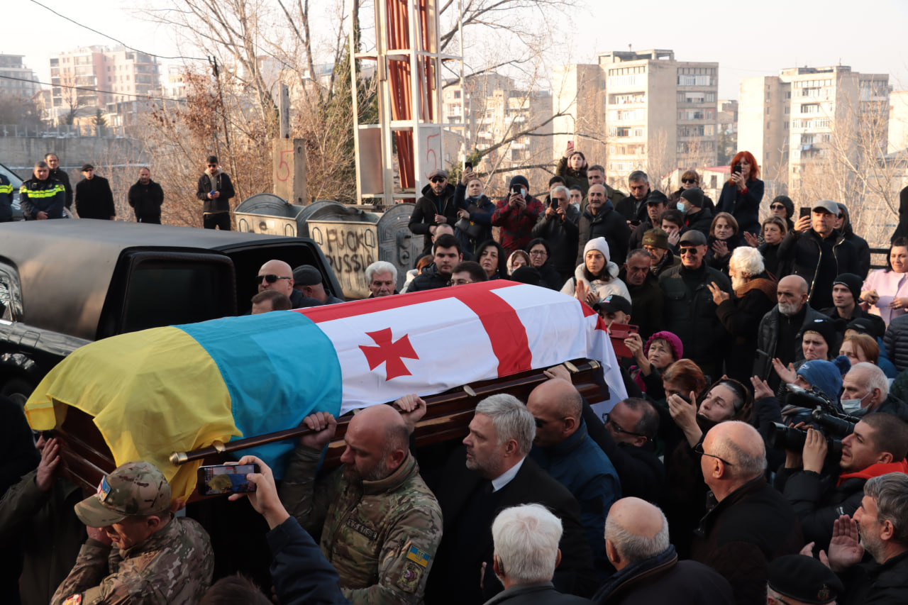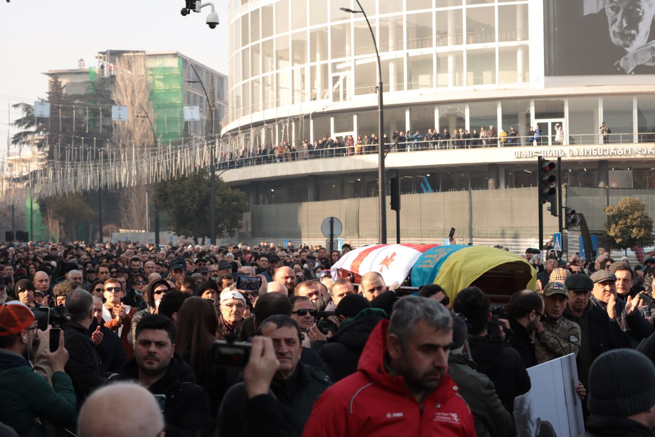 После прощальной церемонии гроб вынесли под аплодисменты сотен собравшихся на улице жителей Тбилиси. Люди отправились вслед за катафалком на Верийское кладбище, где артиста по его собственной просьбе, похоронили рядом с могилой матери. На церемонии присутствовали знаменитые артисты, а также ветераны Грузинского легиона, который воюет в Украине.[fancy_gallery gallery=0]