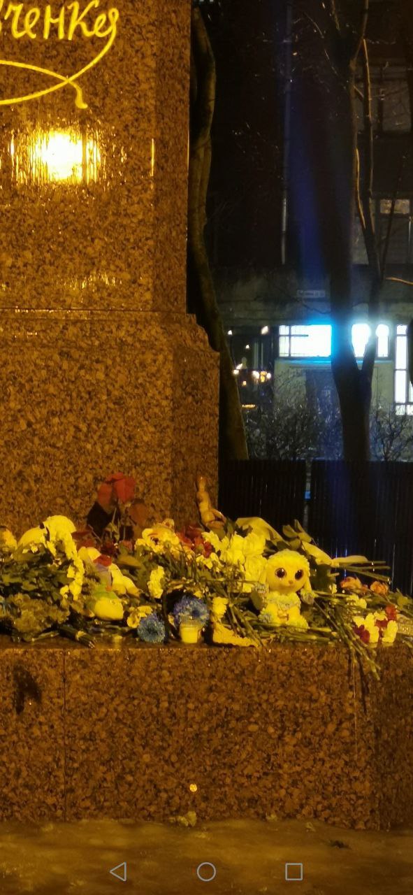 По словам очевидцев, к вечеру цветов у памятника стало еще больше. Жительница Петербурга Олеся, гулявшая с собакой в сквере Шевченко, рассказала «Бумаге», что люди подходили с цветами и детскими игрушками к памятнику каждые пять минут.