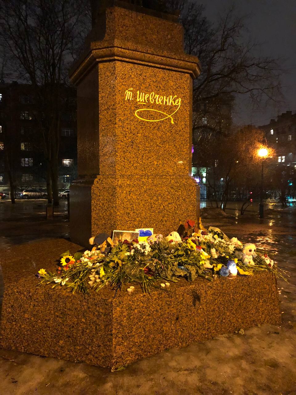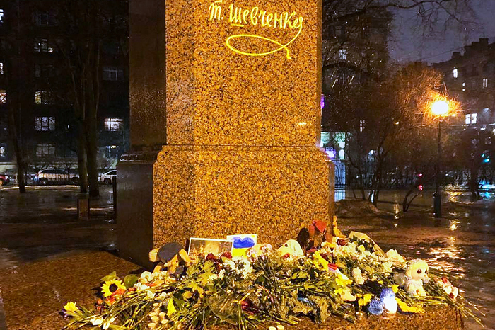 В тот же вечер петербуржцы возложили цветы к памятнику украинскому поэту Тарасу Шевченко в Петроградском районе. Они также сложили слово «Днепр» из свечей.