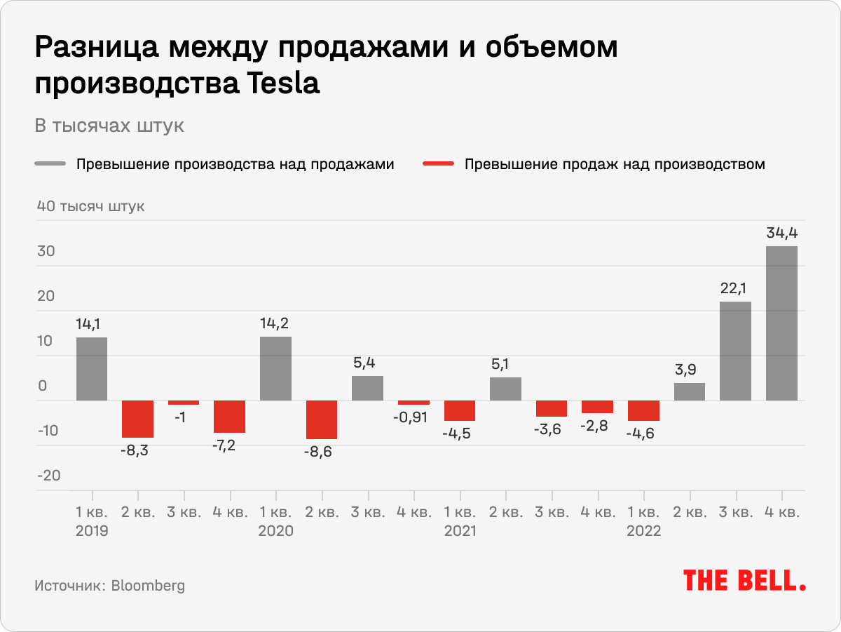 Снижение цен на ключевых рынках знаменует резкое изменение стратегии компании. В последние годы спрос на электромобили значительно превышал предложение. Еще в начале 2022 года время ожидания авто Tesla составляло 9 месяцев — теперь это в прошлом, пишут аналитики Morgan Stanley (отчет есть у The Bell). В четвертом квартале компания произвела на 34 тысячи авто больше, чем удалось продать. Это небольшой показатель, но тренд явно негативен (см. график ниже).