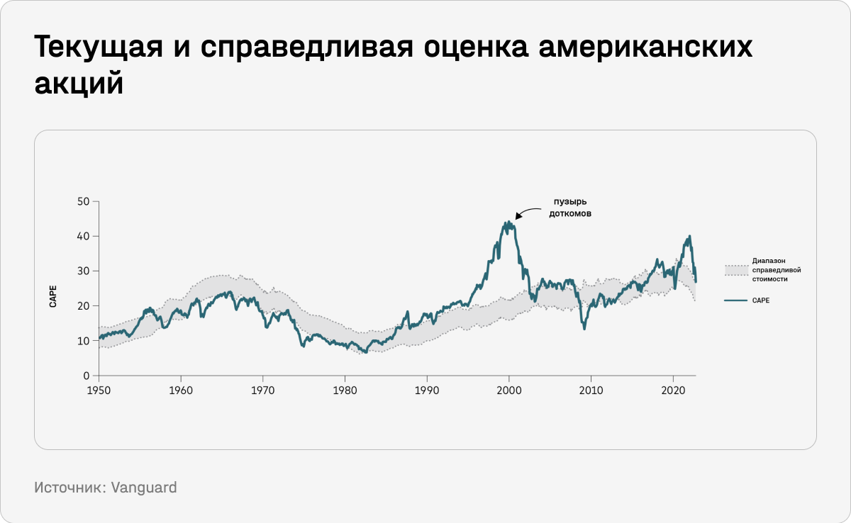 Обоснованность текущей оценки акций США аналитики Vanguard определяли как отношение текущего значения циклически скорректированного индекса Шиллера (cyclically adjusted Shiller price/earnings ratio, CAPE) к «справедливому» значению CAPE для американского рынка акций в 1940–2022 годах.