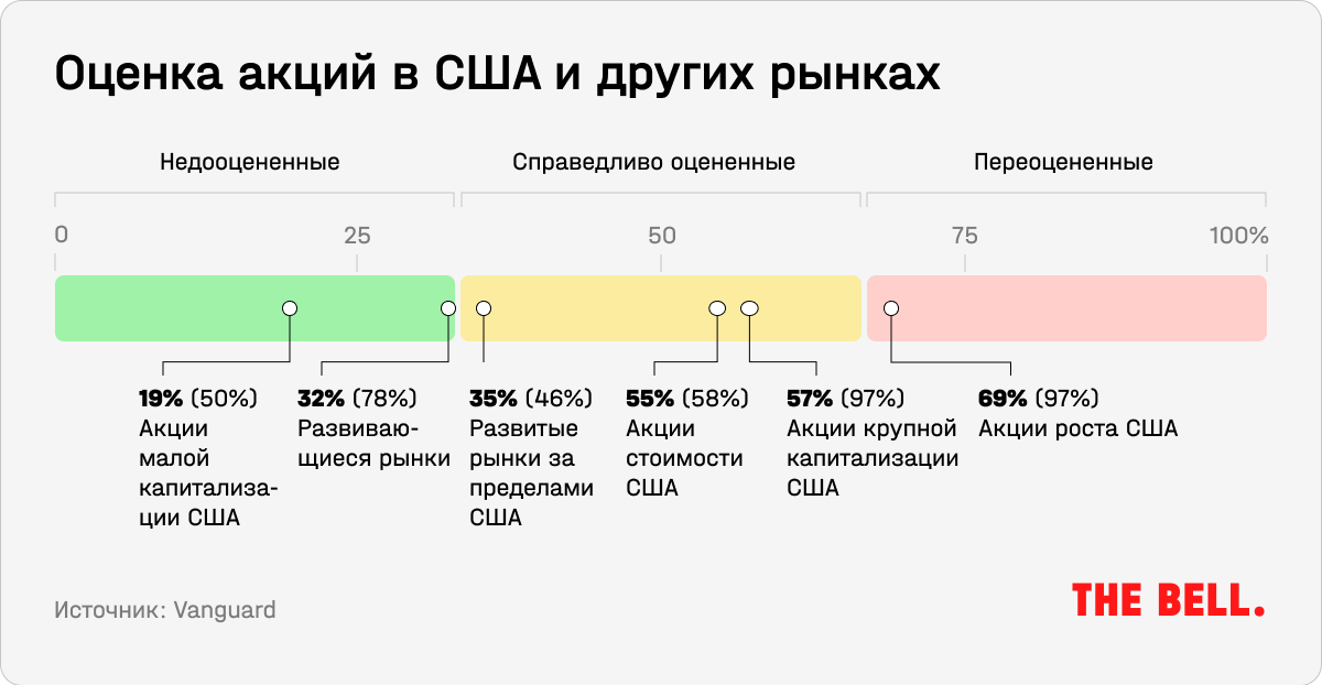 Несмотря на значительное снижение оценок акций из-за изменения ожиданий по ставкам в прошлом году, американские бумаги все еще остаются переоцененными с точки зрения ожидаемой в ближайшие 10 лет доходности. Об этом говорится в стратегии крупнейшего в мире провайдера и основоположника индексных фондов Vanguard, выпущенной в конце 2022 года. Мировые акции теперь, напротив, находятся на нижней границе справедливой оценки.