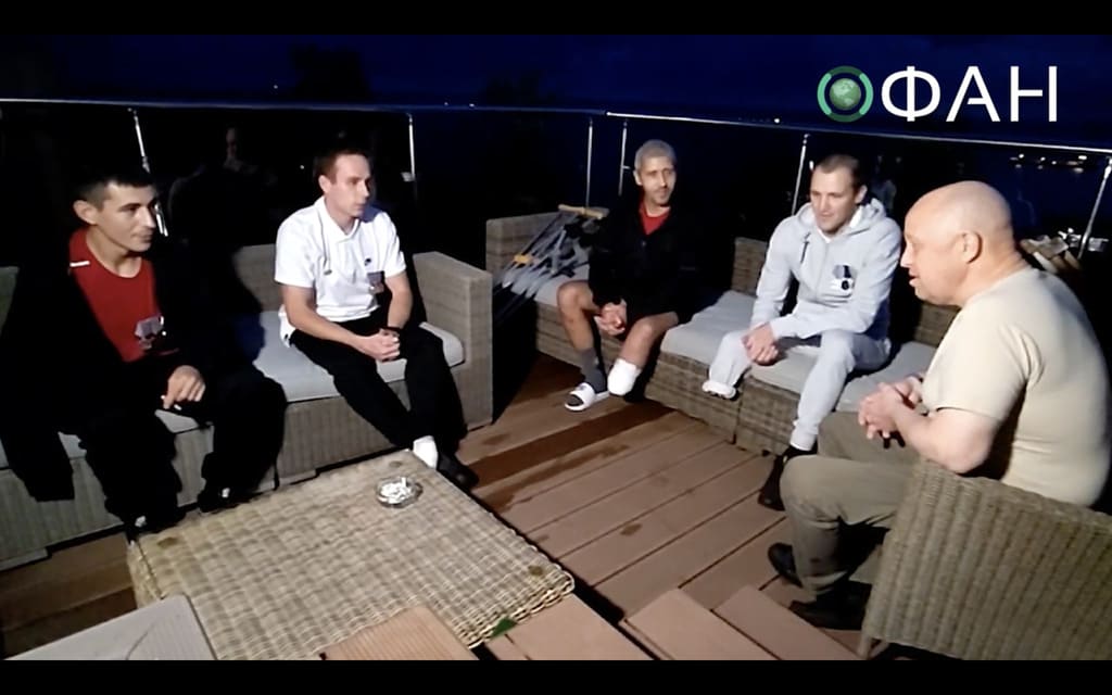 Те же первые помилованные вагнеровцы с основателем ЧВК Евгением Пригожиным, который поздравил их лично