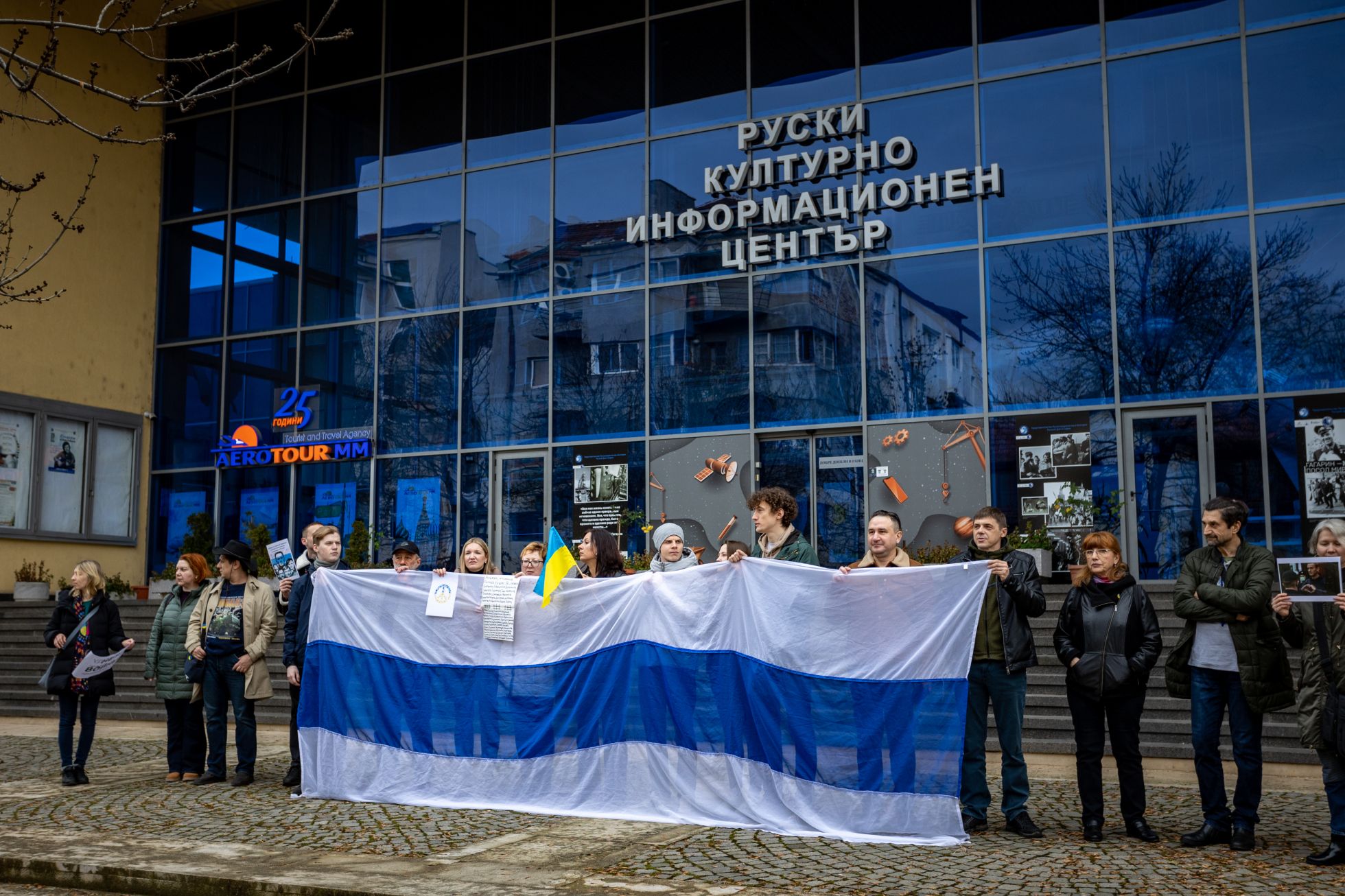 Protestors gathered near the Kulturhuset Stadsteatern theater. They carried Ukrainian and anti-war Russian flags and posters with the names and photographs of destroyed Ukrainian cities. In a video posted by Sotavision, musicians play the song “We Walk in Silence” by Soviet-Russian punk band Grazhdanskaya Oborona (Civil Defense), with some lyrics replaced by the phrase “Glory to Ukraine.”