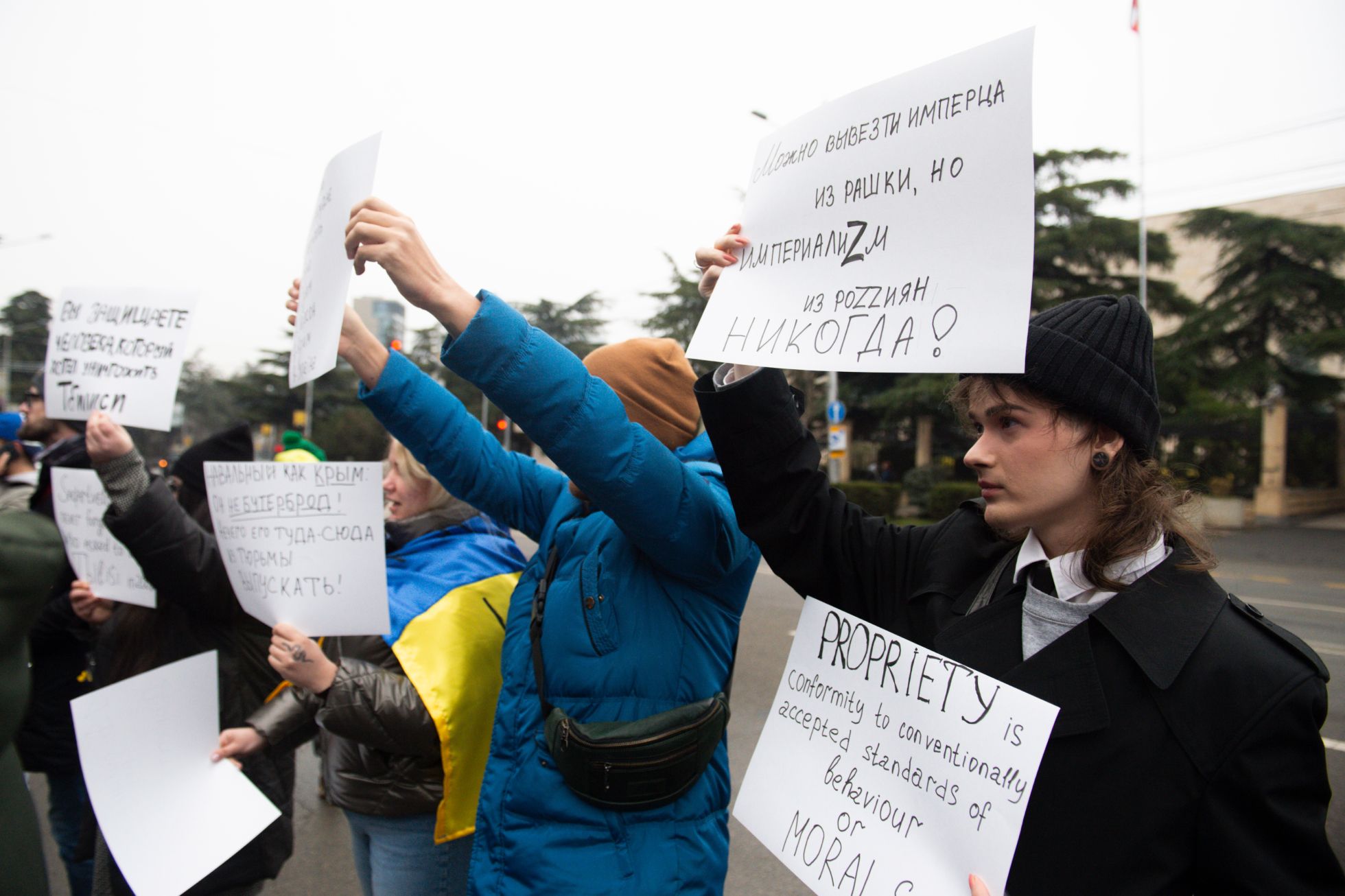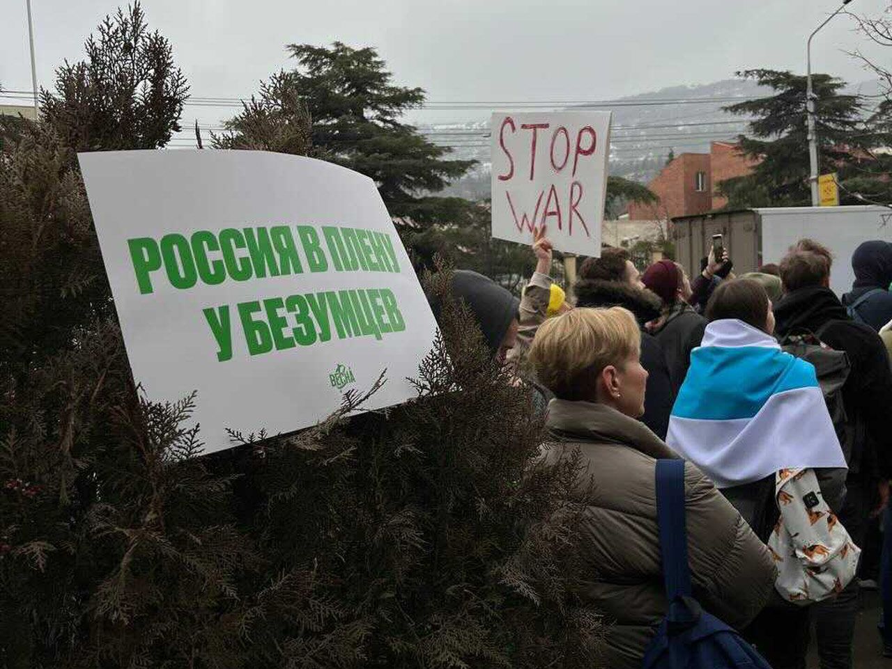 В Тбилиси на акцию в поддержку Навального и российских политзаключенных демонстранты вышли и с антивоенными плакатами.