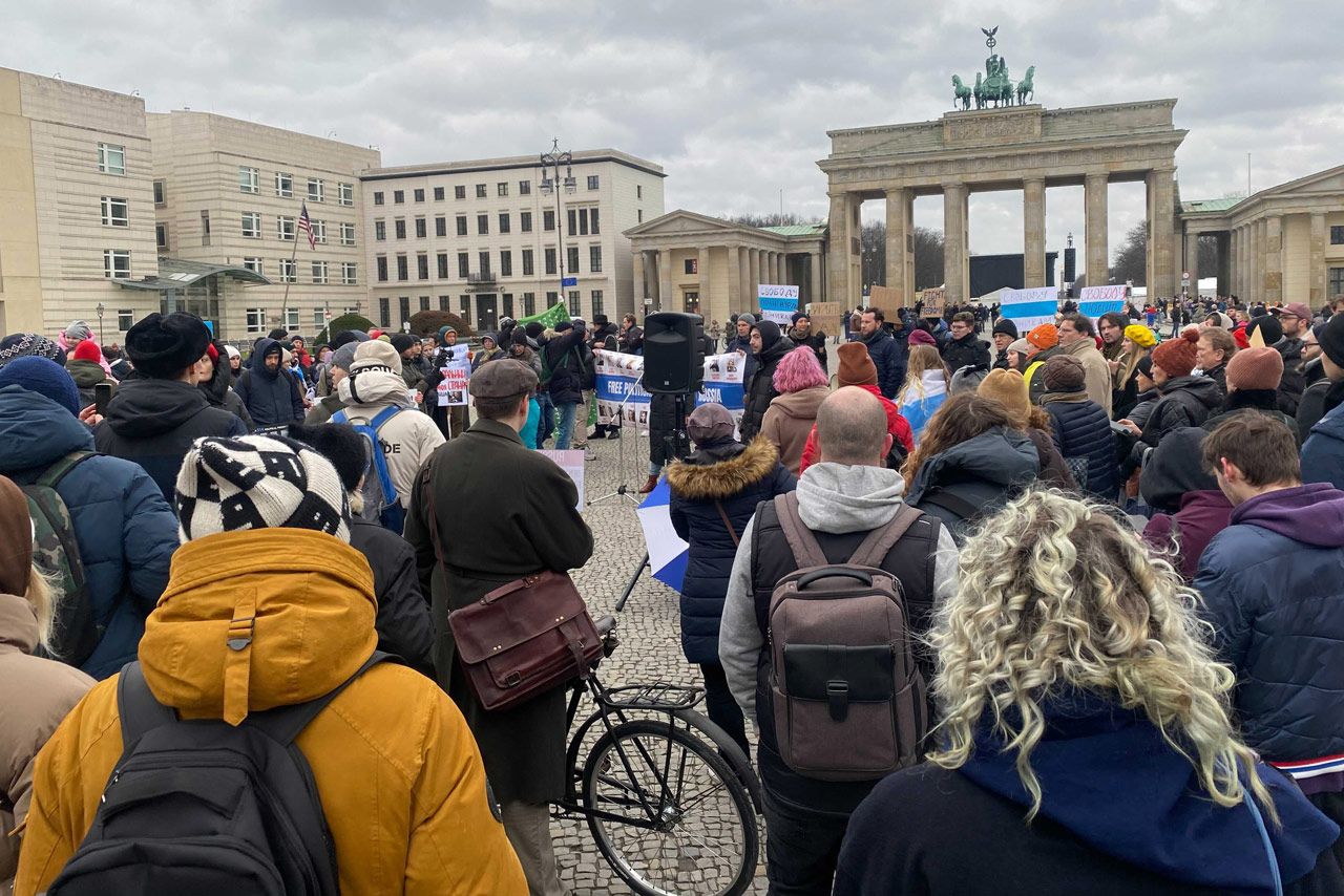 В Берлине на акции в поддержку Навального и российских политзаключенных находится корреспондент «Медузы». По ее словам, еще до официального начала мероприятия на площади возле Брандербургских ворот собрались не менее 150 человек.