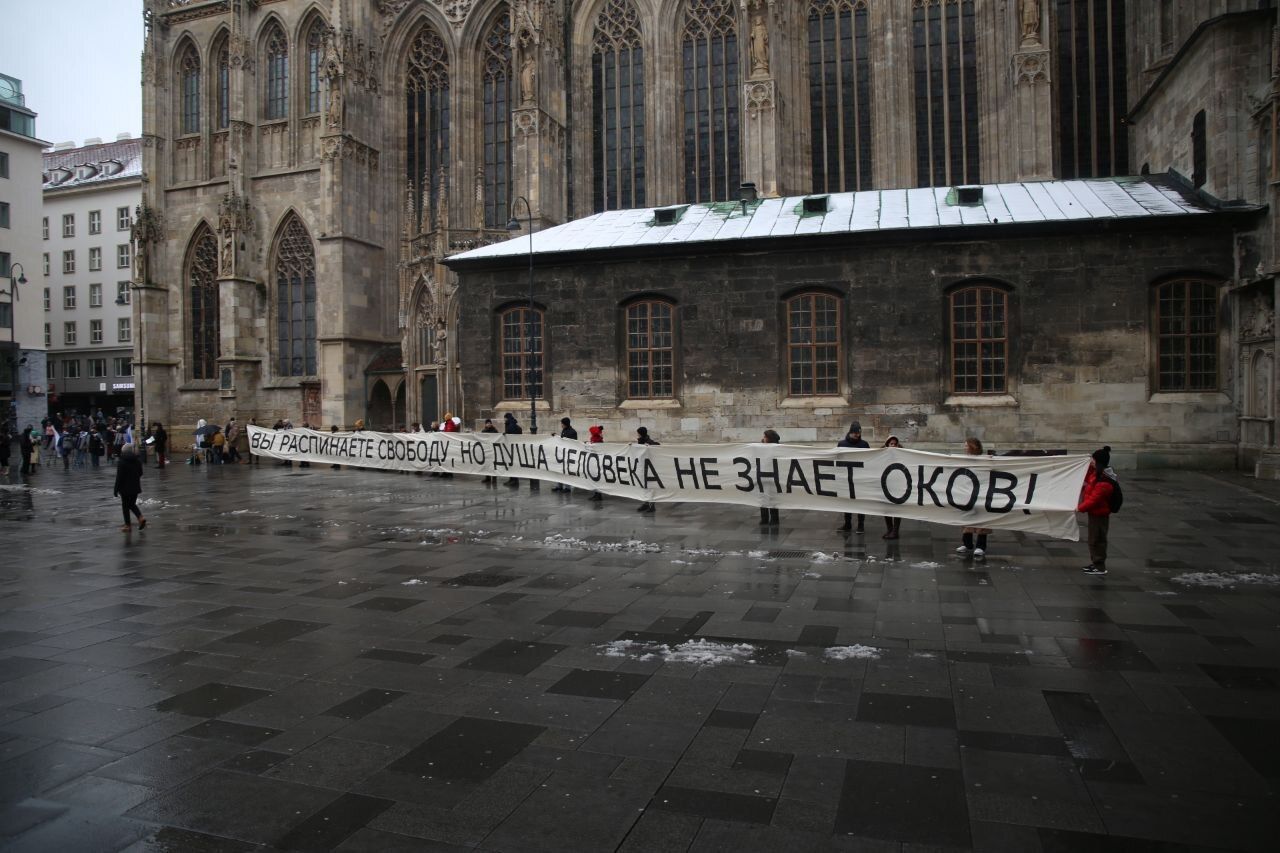 В столице Австрии во время акции в поддержку политзаключенных активисты развернули 30-метровый баннер «Вы распинаете свободу, но душа человека не знает оков!» Такую же надпись оставили в августе 1976 года на стене Петропавловской крепости в Петербурге художники Юлий Рыбаков и Олег Волков. За этот поступок, одну из первых акций политического искусства в СССР, они были приговорены к шести и семи годам колонии соответственно. В расследовании этого уголовного дела принимал участие Владимир Путин, на тот момент 23-летний лейтенант КГБ.