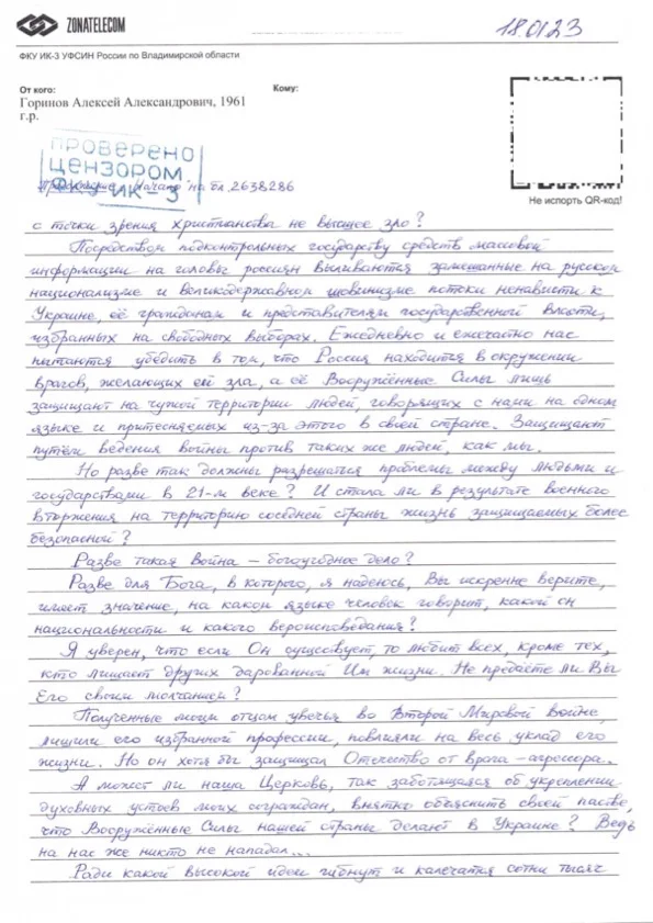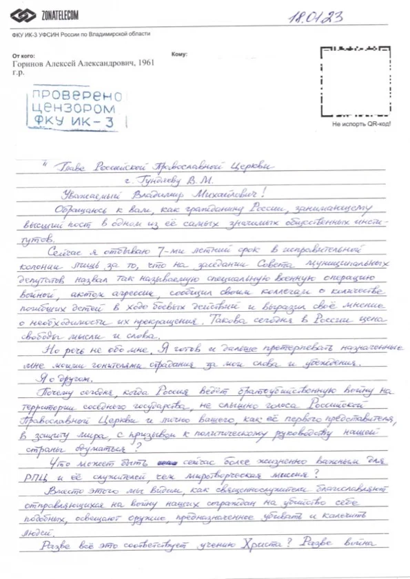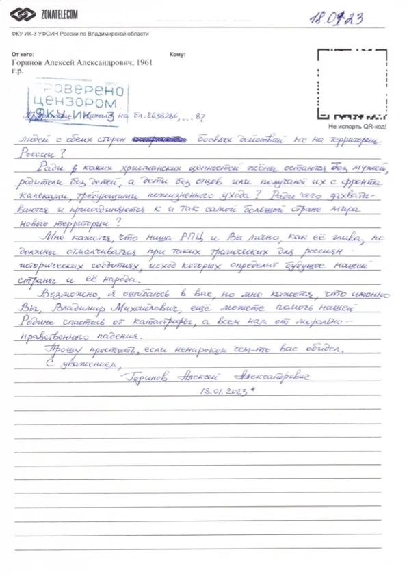 Letter from jailed Russian politician Alexey Gorinov to Patriarch Kirill