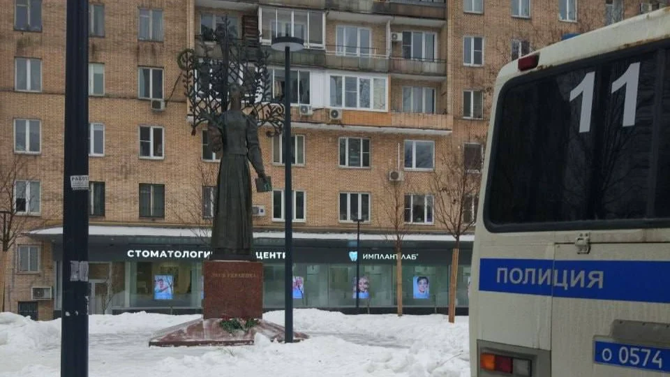 Вечером 20 января на Украинском бульваре пустынно и тихо. В темноте памятник легко не заметить, но — как опознавательный знак — буквально в метре от него мигает огнями полицейская машина. Не выходя из нее, сотрудники внимательно наблюдают за всеми, кто подходит к памятнику. Возложение цветов в такой близости от них кажется тревожным и небезопасным поступком. Стоило мне ненадолго остановиться рядом с памятником, как открылась дверца машины. Я сделала вид, что просто иду мимо, — и полицейский тут же вернулся обратно в салон, убедившись, что я не собираюсь приближаться к монументу.