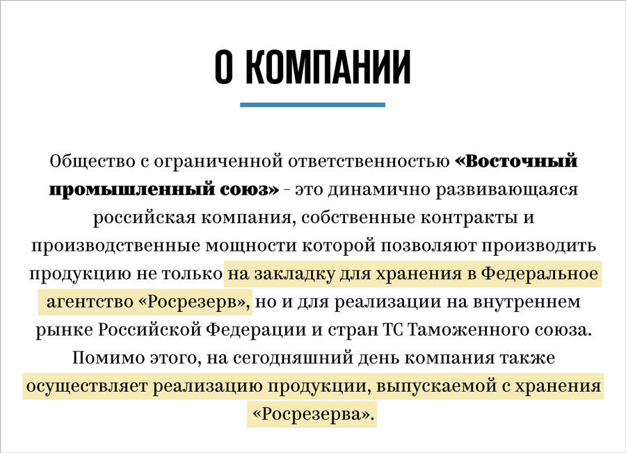 Один со «Стронгом» холодильный склад на Якорной улице в Санкт-Петербурге используют еще два поставщика мяса «Юнифрост» и «Легион», у которых прослеживаются связи с «Агро-Лайном». Как минимум один из них торгует с Росрезервом, в том числе через компанию-посредник «Восточный промышленный союз» (ВПС) , следует из реестра деклараций соответствия. ВПС и связанный с ним «Триал» , который продает в резерв мясо и покупает там металлы, а также владеет поставщиком рыбных консервов для Росрезерва «Нацрыбпром» любопытны тем, что открыто пишут на своих сайтах о работе с одним из наиболее секретных российских ведомств.
