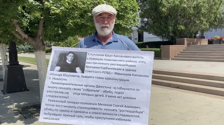 "Правоохранительные органы не собираются по закону наказать своих "собратьев" – убийц, подло расстрелявших отца пятерых детей", – написал на плакате, с которым вышел в одиночный пикет в центре Махачкалы, отец погибшего Юсуп Капланов. Он просил главу Дагестана Сергея Меликова восстановить справедливость – наказать обвиняемых в убийстве и следователей, которые, по его мнению, пытаются их прикрыть.
