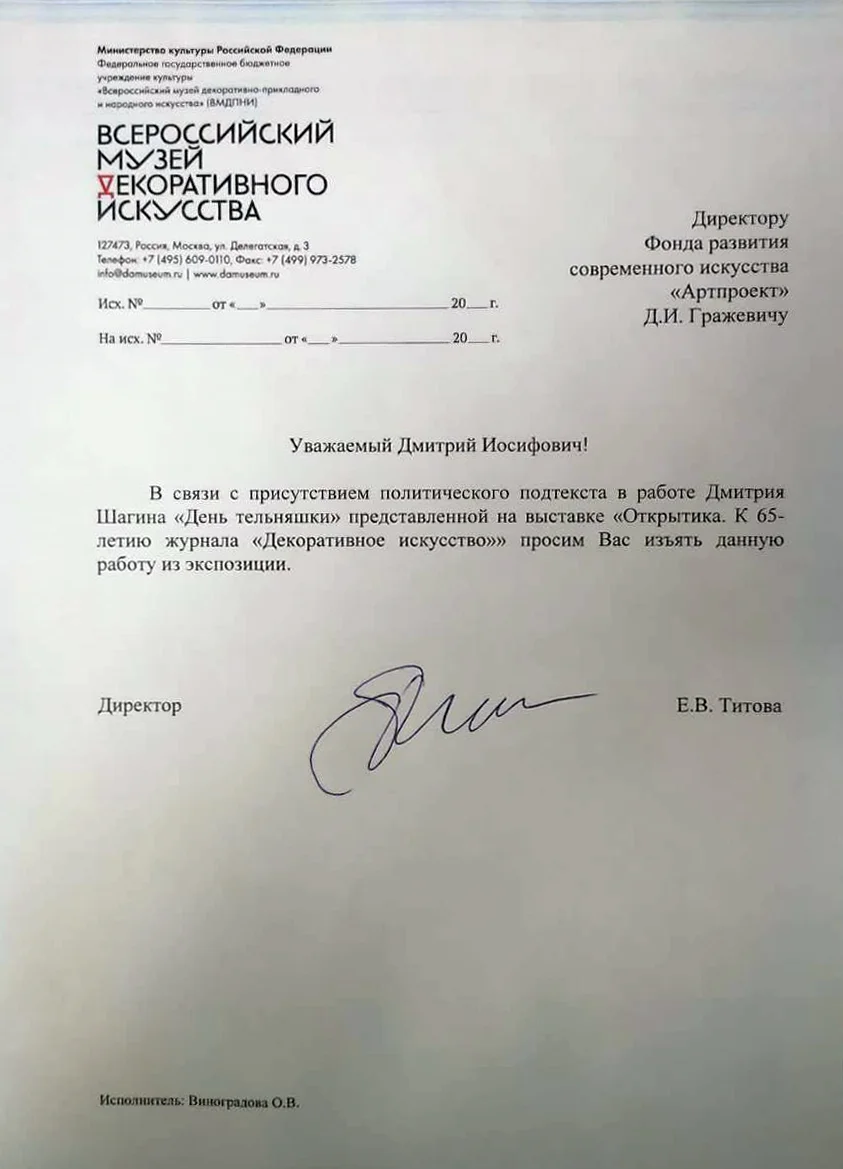 Во Всероссийском музее декоративного искусства в Москве только что закончилась выставка «Открытика. К 65-летию журнала «Декоративное искусство». По недосмотру организаторов мероприятие едва не было омрачено проникнувшей на выставку картиной Дмитрия Шагина «День тельняшки», на которой носители этого атрибута Вооруженных сил РФ, в частности ВДВ, фигурировали под лозунгом «Митьки никого не хотят победить».