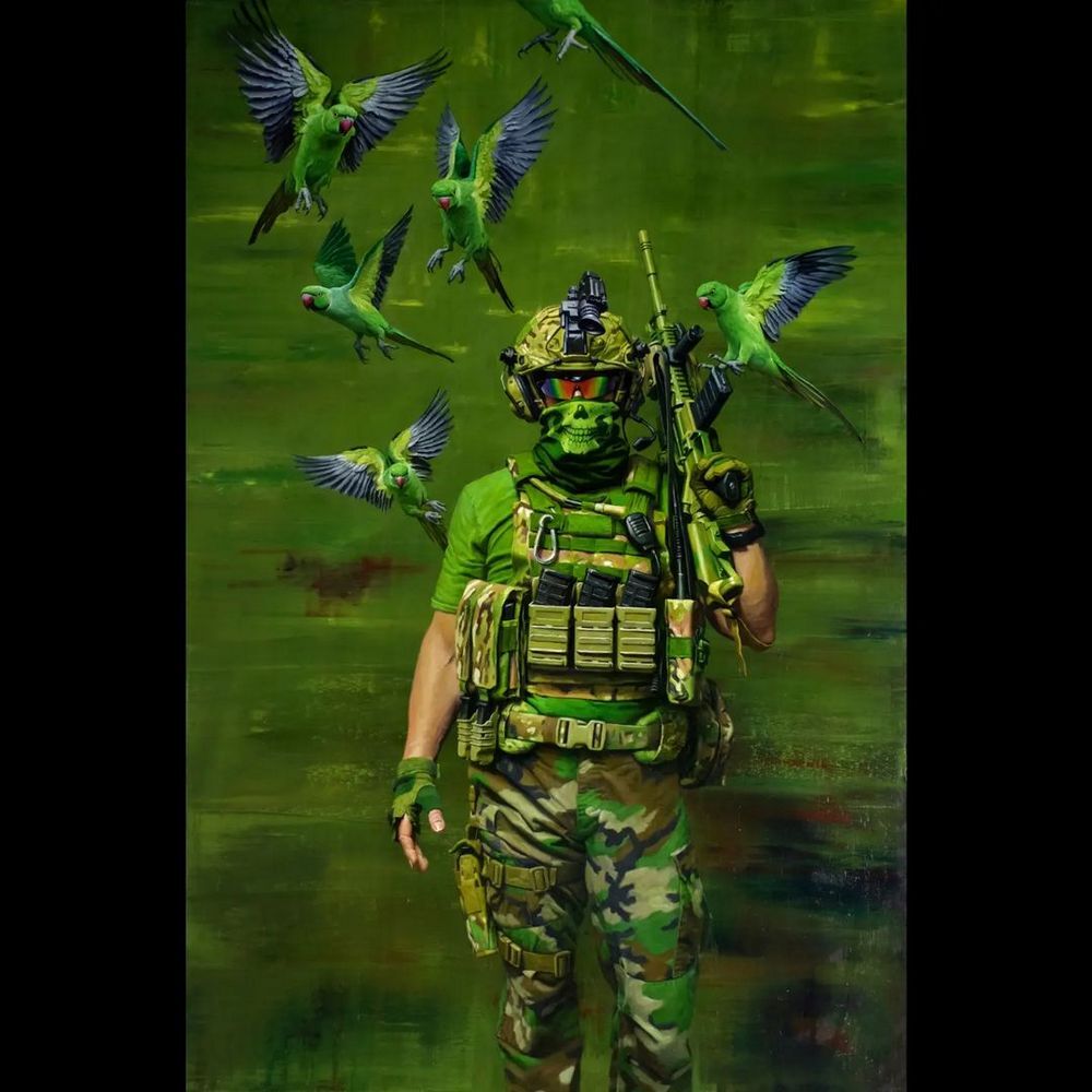 В день открытия выставки «Новый порядок» в «ЧВК Вагнер Центре» собралось порядка 30 человек, сообщил корреспондент «Бумаги» с места событий. Обещанной Монтлевичем фотозоны не было, гостям раздавали буклеты с текстом, что «искусство стало новым фронтом эстетического и этического суверенитета». Пестро-зеленые образы военных были развешены на стенах первого этажа центра и соседствовали с белыми голубями.