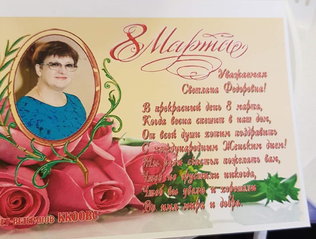Дальше мы находим ещё одну интересную фотографию — это поздравительная открытка с портретом Светланы Шишкуновой, её именем и отчеством. Банальные стишки к восьмому марта нас не интересуют, а вот подпись в левом нижнем углу — да.