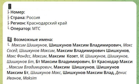 Чтобы быть уверенными на 100%, ищем номер телефона Максима Шишкунова в слитых базах. Через известный Telegram-бот проверяем, как он записан в телефонных книгах других людей. «Максим Шишкунов», «Макс Сосед», «Максим Козет» — именно к Козетскому поселению относится Зелёный остров, домом на котором владеет отец Максима.