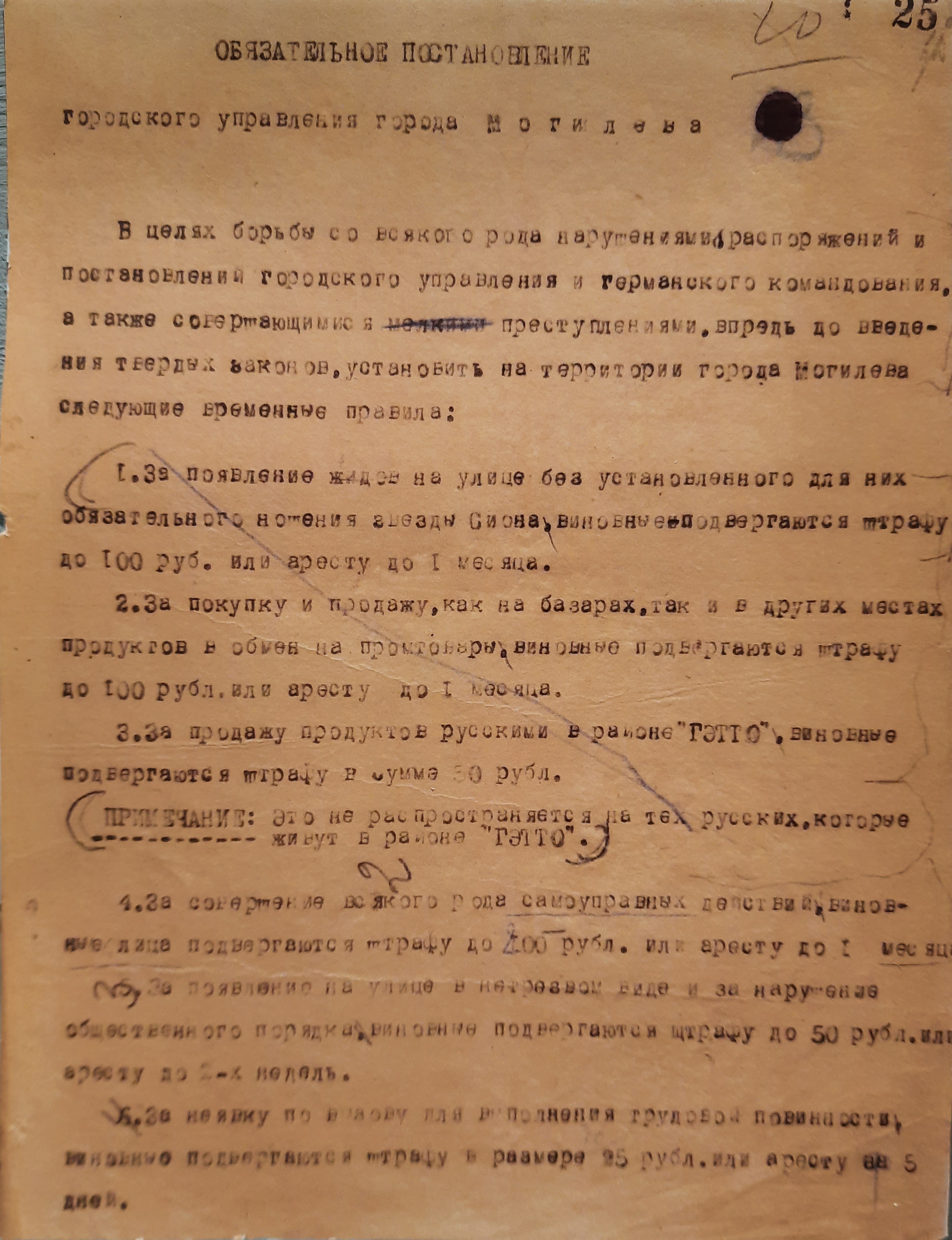 Текст их известен: "По распоряжению господина коменданта города Могилева все лица еврейской национальности обоего пола обязаны в течение 24 часов покинуть пределы города и переселиться в полосу ГЭТТО. Лица, не выполнившие указанное распоряжение в указанный срок, будут полицией выселены насильно, имущество этих лиц будет конфисковано".