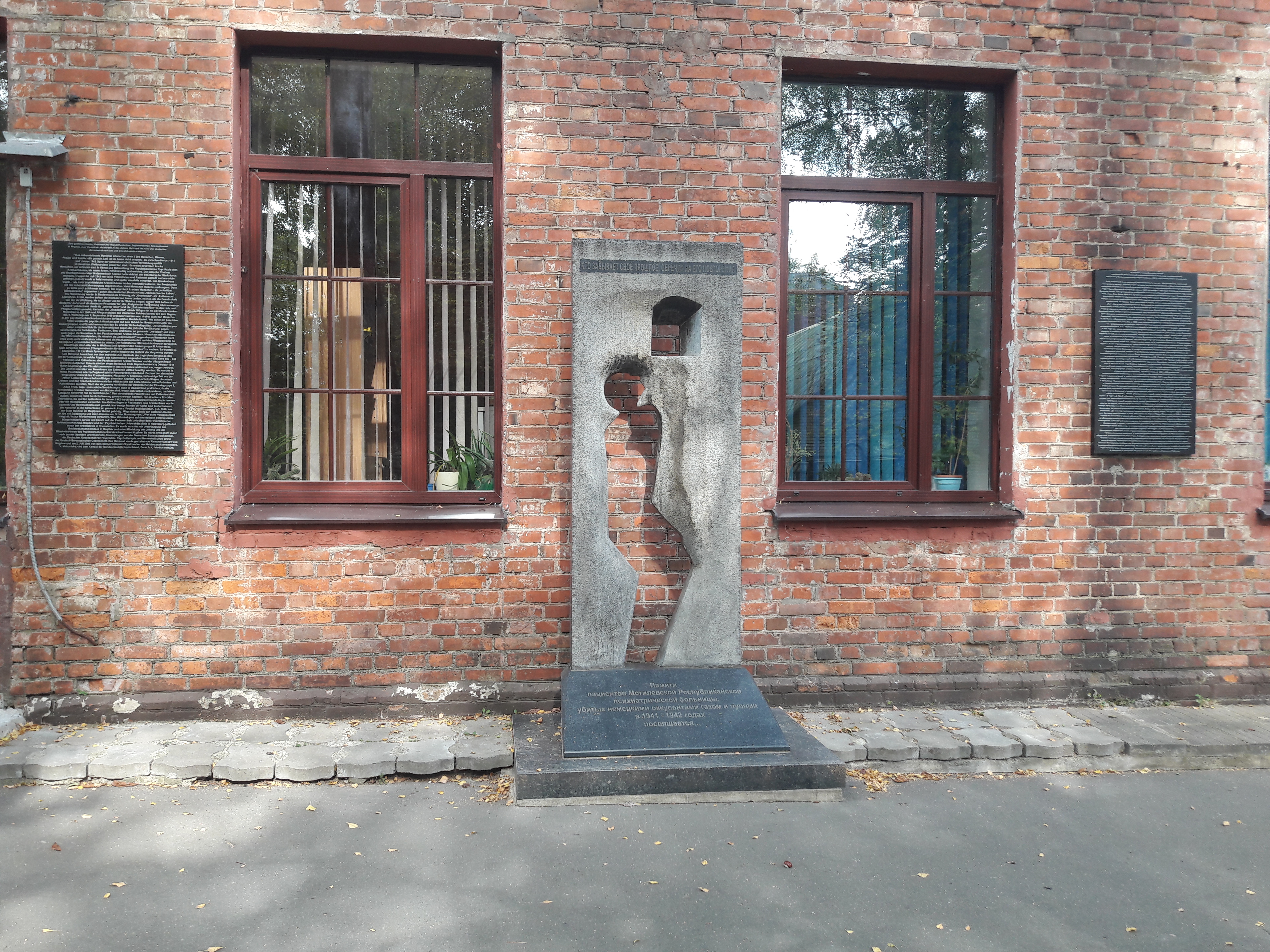 "В соответствии с переписью населения 1939 года, в Могилеве насчитывалось: 99 400 жителей (в том числе 19 715 евреев – 19,83 %). В 1941 году в городе проживало 120 тысяч жителей... 26 июля 1941 года Могилев был оккупирован. На территории города были созданы 5 лагерей смерти, лагерь для гражданского населения на территории завода им. Димитрова (сейчас завод "Строммашина"), рабочий лагерь на территории шелковой фабрики, центральный лагерь СС на территории авторемзавода, лагерь на территории Быховских кавалерийских казарм, трудовые лагеря… После уничтожения большей части евреев примерно тысяча оставшихся в живых… перемещена в концлагерь на территории завода им. Димитрова. В годы войны в Могилеве и окрестностях погибло более 70 тысяч советских граждан, в том числе жителей города и окрестностей, военнопленных, беженцев, евреев из Могилевского района, Слонима и Польши (не менее 10,5 тысяч)".