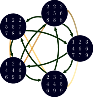 Авторы рассматривают начинающий мутировать исходный набор из пяти игральных костей с девятью гранями каждая, имеющих следующие числа на гранях. Стрелками обозначены отношения доминирования («чаще показывать большее число при попарных бросаниях») (рис. 1).