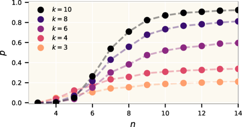 Полученные методом Монте-Карло вероятности k гамильтоновых нетранзитивных циклов в наборах из k костей как функция от числа граней n у каждой кости. Гамильтонов цикл в графе — «простой цикл, содержащий все вершины графа. Простым называется цикл, в последовательности вершин которого все вершины встречаются ровно один раз»4
