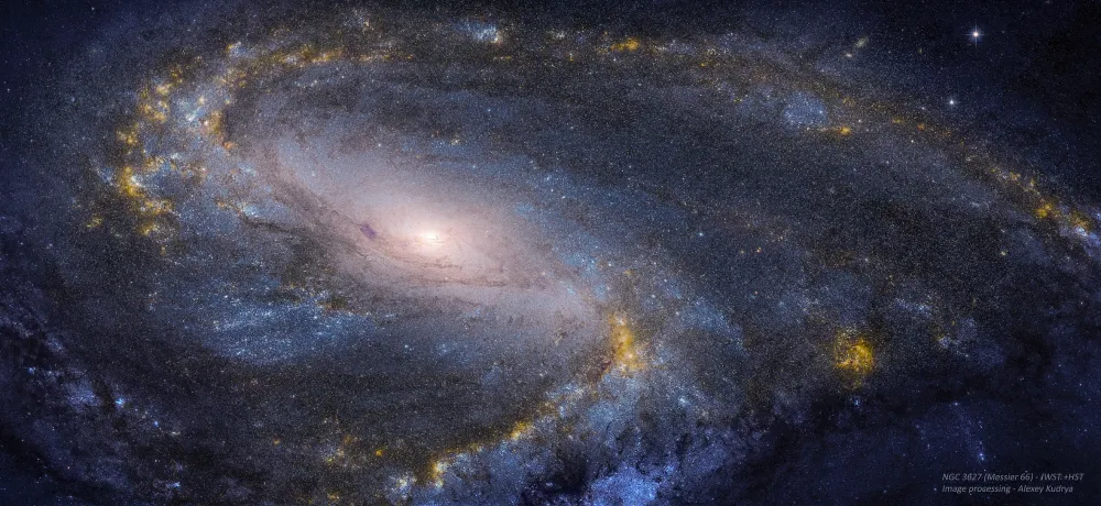 Галактика NGC 3627, известная также как Мессье 66 (т. е. она является 66-м объектом в знаменитом каталоге туманностей французского астронома Шарля Мессье (1730–1817)), расположена в созвездии Льва. Расстояние от Солнца до NGC 3627, оцениваемое на основании величины красного смещения (z), — 35 млн световых лет (10,7 Мпк).