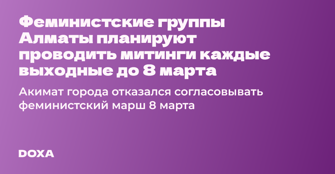 Представительницы оргкомитета феминистского митинга и марша Алматы подали уведомление о проведении митинга на ближайшие выходные. Они собираются проводить митинг каждые выходные перед 8 марта из-за того, что акимат отказал им в проведении митинга в день 8 марта.