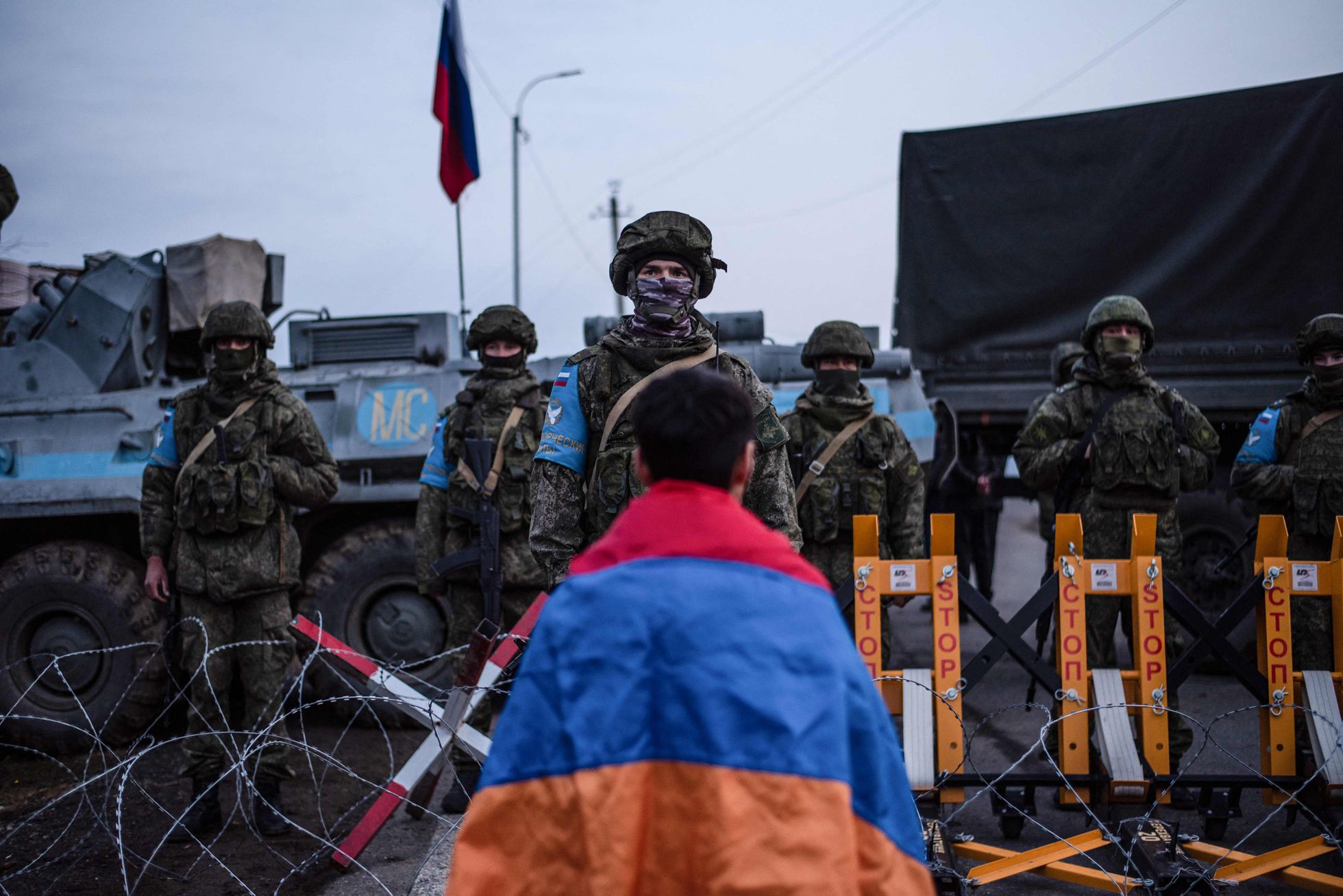 Davit Ghahramanyan / AFP / Scanpix / LETA Противник блокады у блокпоста российских миротворцев под Степанакертом. 24 декабря 2022 года