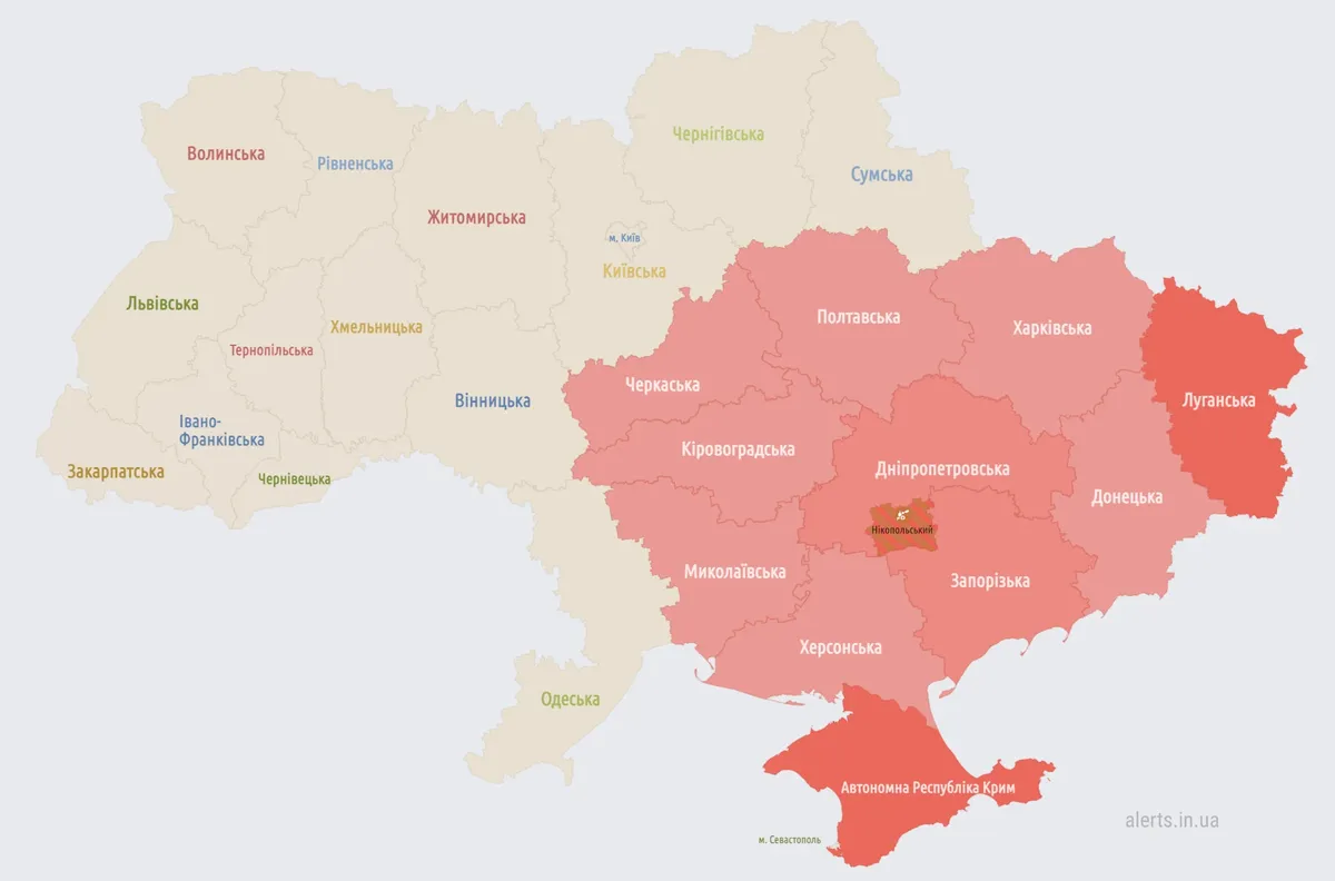 Воздушная тревога объявлена в 10 областях Украины и в аннексированном Россией Крыму, следует из данных alerts.in.ua.
