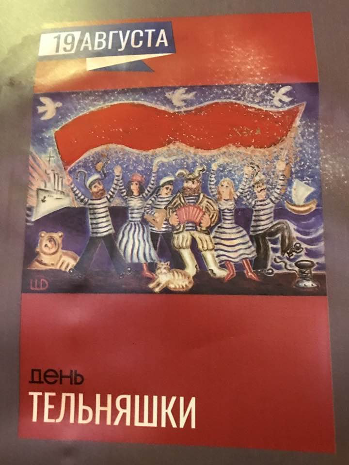 Детали. Картина «День тельняшки» была частью экспозиции выставки «Открытка. К 65-летию журнала „Декоративное искусство“», которая была представлена с 28 декабря по 22 января. На картине изображены люди в тельняшках с транспарантом «Митьки никого не хотят победить!».