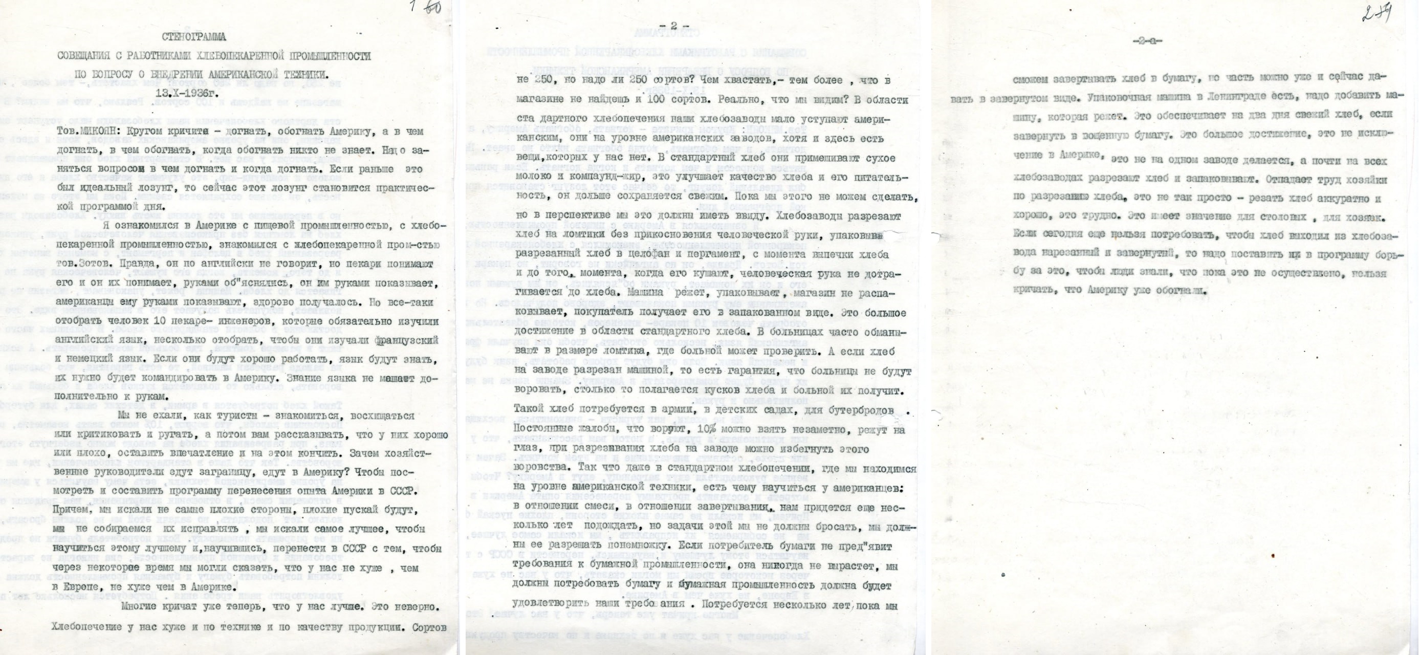 В ГА РФ хранится стенограмма выступления Микояна на совещании с работниками хлебопекарной промышленности, которое было посвящено внедрению в хлебную индустрию американских технологий. Как можно понять из этого совещания, «тот самый» советский хлеб тоже, по крайней мере, частично, является американским индустриальным продуктом. Микоян на этом совещании объясняет, в чем именно отстала советская хлебная промышленность, указывает на то, что американцы добавляют в рецептуру хлеба сухое молоко и компаунд-жир, и по идее это неплохо делать и в Союзе (хотя нарком признает, что пока это по разным причинам невозможно). Однако главное, что, по-видимому, действительно очень заинтересовало Микояна на американских хлебопекарных заводах, — это технические особенности готового продукта: он увидел, что хлеб можно заранее нарезать еще на заводе и продавать упакованным в нарезке. Микоян специально рассказывает советским хлебопекам, что в Америке «хлебозаводы разрезают хлеб на ломтики без прикосновения человеческой руки, упаковывают разрезанный хлеб в целлофан и пергамент, с момента выпечки хлеба и до того момента, как его кушают, человеческая рука не касается хлеба». Микоян, почти как лесковский Левша, увидевший, что у англичан ружья кирпичом не чистят, расписывает это «большое достижение в области стандартного хлеба» и объясняет его выгоду для советских условий. Как можно понять, наркома пищевой промышленности страны социализма прежде всего беспокоила проблема воровства продовольствия, которое при государственной системе снабжения и торговли происходило на самых разных этапах изготовления, перевозки и конечной реализации пищевых продуктов. В частности, Микоян указывает, что нарезанный на заводе хлеб будет сложнее украсть в больницах, где его выдают больным кусками (которые при резке на месте всегда можно сделать тоньше, чем полагается). Он даже приводит статистические данные: «10 % можно взять незаметно, режут на глаз». Высказывает он и другие идеи касательно того, где может пригодиться заранее нарезанный хлеб — например, в армии или при изготовлении бутербродов (видимо, на продажу). Наконец, в этом случае «отпадает труд хозяйки по разрезанию хлеба, это не так просто — резать хлеб аккуратно и хорошо, это трудно». Микоян предполагает, что через несколько лет советские хлебозаводы смогут нарезать хлеб сами, а бумажная промышленность будет выпускать необходимый материал для упаковки (на целлофан от советской промышленности нарком, видимо, не рассчитывал). При этом Микоян специально говорил о том, что хлебозаводы должны ставить четкие цели по выпуску разрезанного хлеба: «Чтобы люди знали, что пока это не осуществлено, нельзя кричать, что Америку уже обогнали».