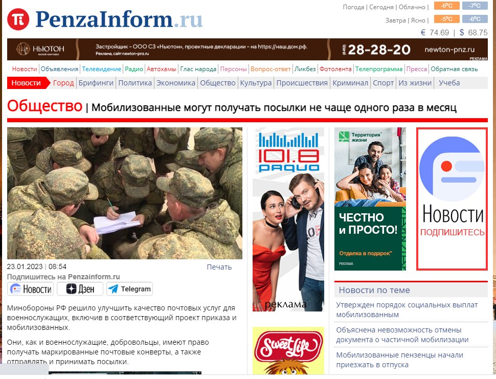 В заголовке новости от 23 января 2023 г., размещенной на сайте «Пензаинформ» говорится, что «Мобилизованные могут получать посылки не чаще одного раза в месяц».