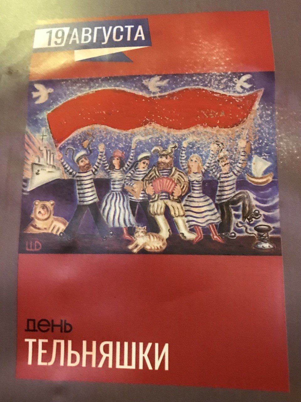 Предложение принять участие в выставке Шагин получил еще осенью. Его попросили нарисовать что-нибудь на тему "Открытки" для праздника. Дмитрий сразу предложил картину на тему Дня тельняшки, который празднуется в Петербурге 19 августа. Сюжет – люди в тельняшках, а над ними развевается красный флаг, на котором белыми буквами написано "Митьки никого не хотят победить". Этот лозунг у митьков существует уже 40 лет, а картина – одна из вариаций на эту тему.