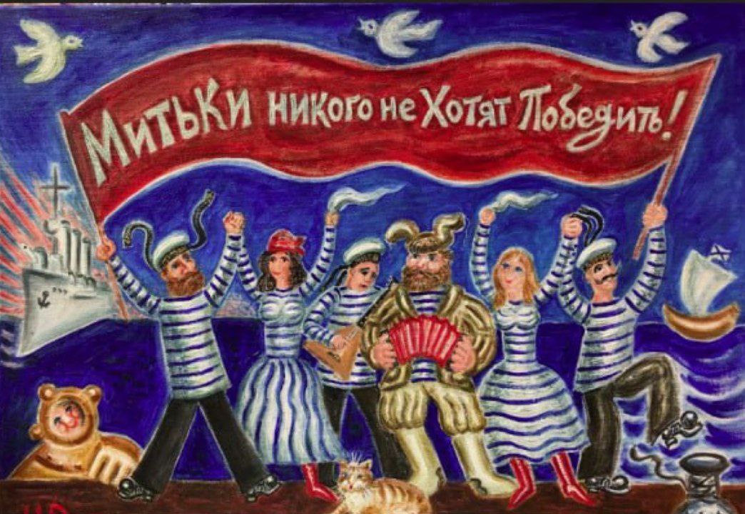 – Я нарисовал эскиз, где братики и сестрички под музыку танцуют, поют, митек на баяне играет, а сзади они несут транспарант "Митьки никого не хотят победить". Это знаменитый лозунг, формула еще середины 1980-х, которая описана в книге Шинкарева, и мультфильм был в 1991–1992 годах. Все про это знают. Это общечеловеческое такое. Собственно, за что митьков и полюбили. За то, что они несут добро и дружбу, свет, любовь и мир. Они никого не хотят, понимаете, победить, никакой агрессии, злобы. Я бы сравнил этот лозунг с песней Beatles "Аll you need is love".