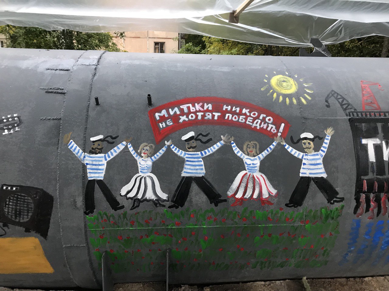 Это не первая выставка после начала боевых действий в Украине, в которой появляется лозунг митьков. По словам Шагина, в октябре он участвовал в фестивале памяти Василия Верещагина в Череповце, в рамках которого с другими художниками он расписывал огромную трубу во дворе школы, где учился поэт и рок-музыкант Александр Башлачев. На трубе тоже были люди в тельняшках с транспарантом: "Митьки никого не хотят победить". Но никого фраза не смутила.