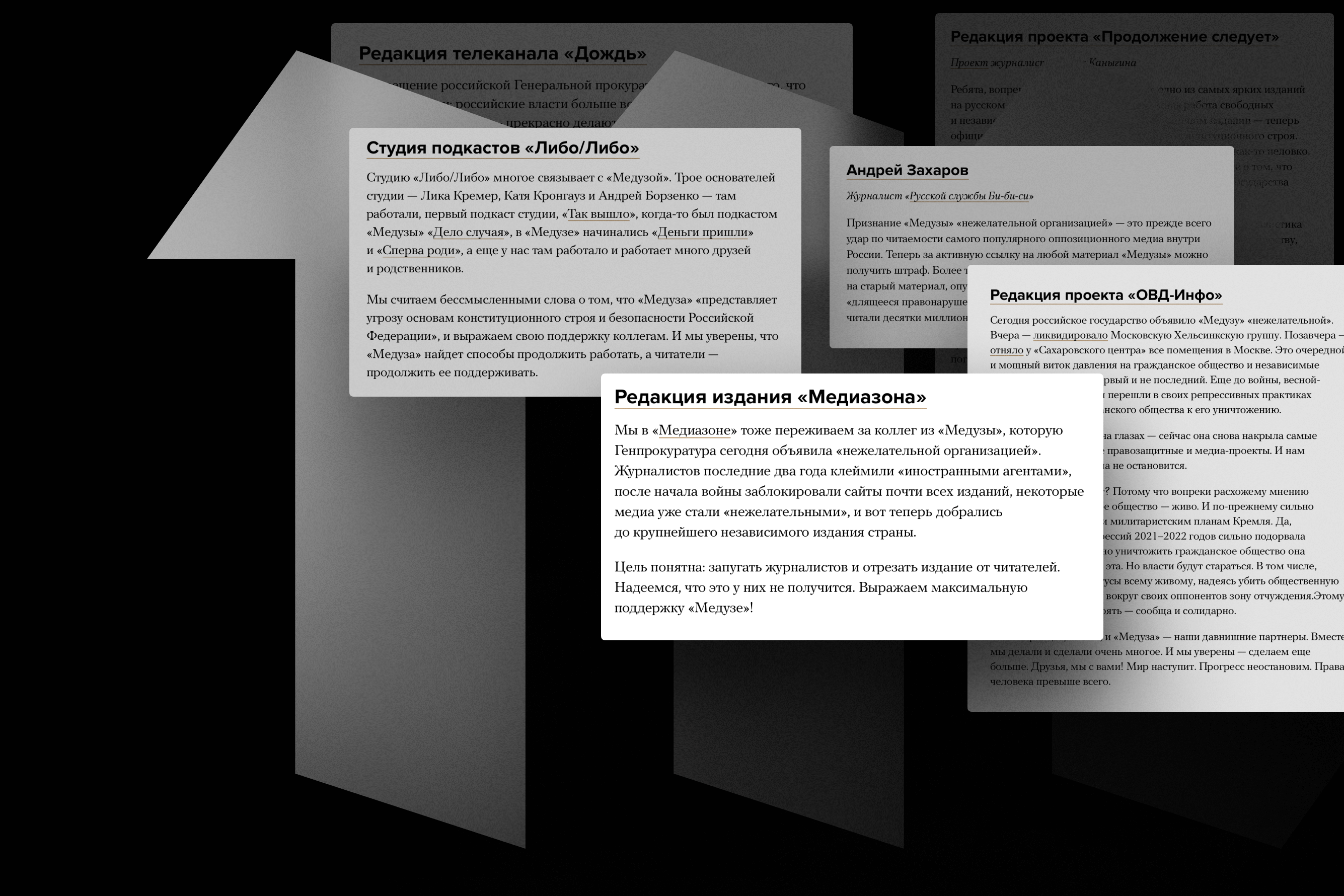 Мы выражаем поддержку изданию «Медуза», которое является примером успешной независимой журналистики, востребованной миллионами россиян. Со статьями и мнениями журналистов и авторов статей можно не соглашаться, но включать для этого все рычаги репрессий — именно это идет против «основ конституционного строя Российской Федерации».