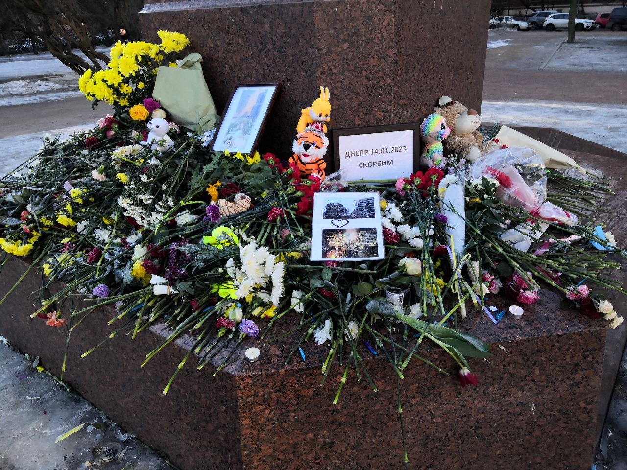 Петербуржцы вторую неделю приносят цветы к стихийным мемориалам в память о погибших в Днепре от российского ракетного удара 14 января. Одна ракета попала в жилой дом — погибли 46 человек, включая шесть детей.