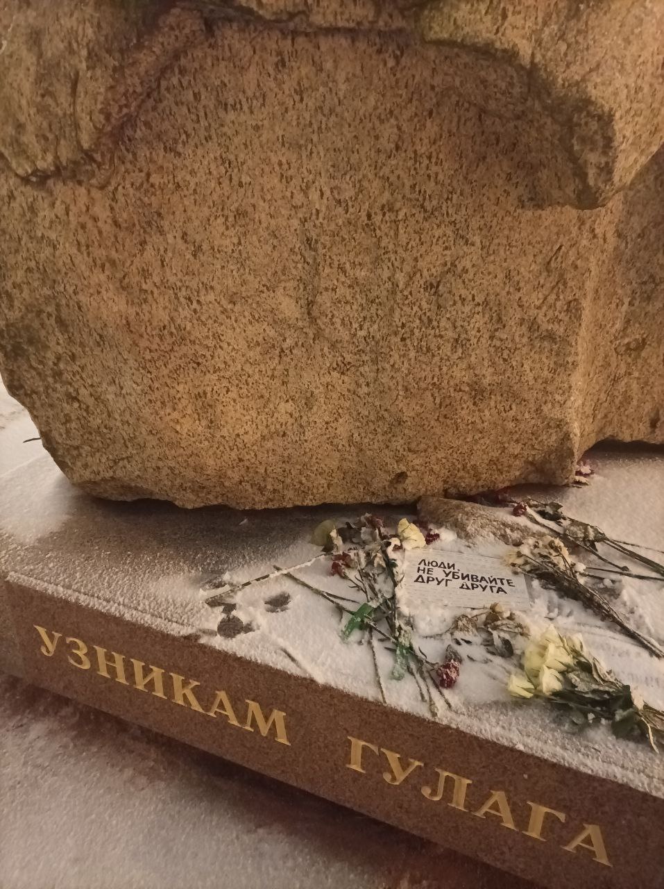 25 января петербуржцы оставили цветы и плакат с надписью «Люди, не убивайте друг друга» возле Соловецкого камня на Петроградской стороне — это памятник жертвам политических репрессий советского времени и борцам за свободу. Камень был привезен с территории Соловецкого лагеря.