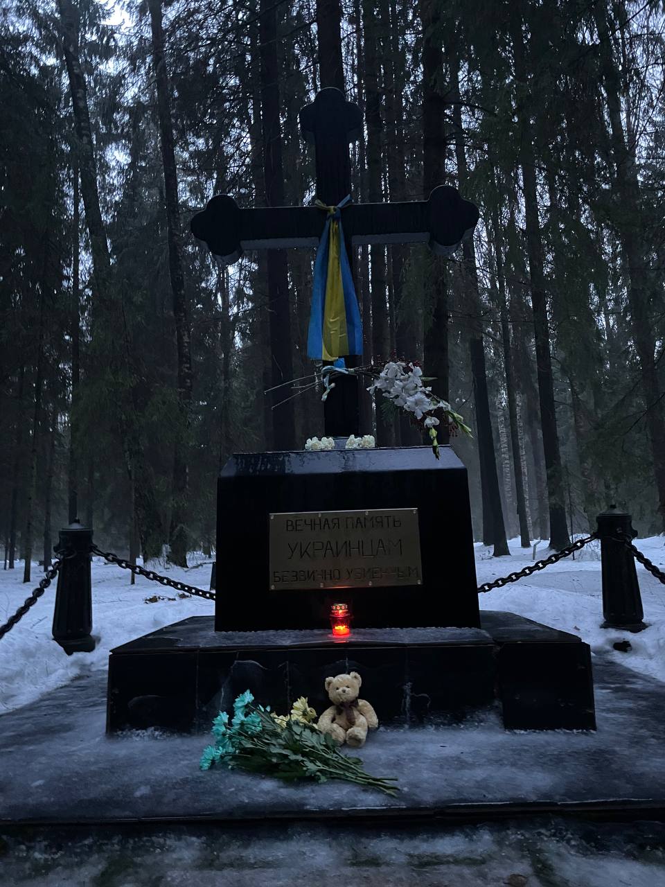 Также петербуржцы оставили цветы и плюшевого медвежонка у памятника жертвам политических репрессий на Левашовском мемориальном кладбище 19 января. На его территории похоронены жители СССР, убитые во времена сталинских репрессий.