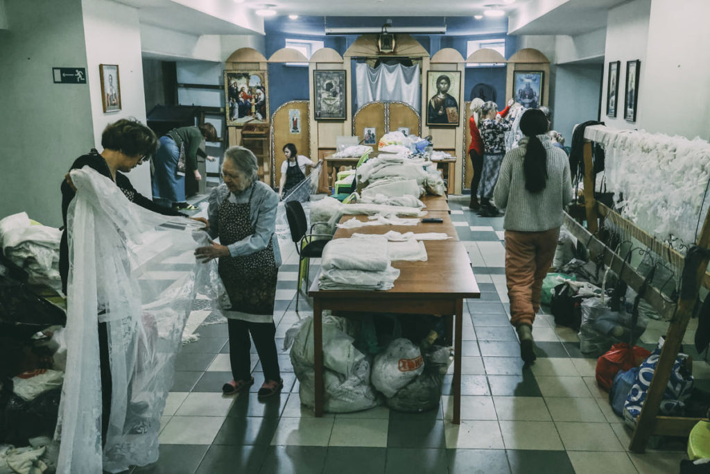 «И постельное бельё нам несут, — продолжает основательница мастерской Наталья. — Вот — совсем новое бельё, очень хорошего качества, ещё с этикеткой. — Она достает из пакета аккуратно сложенный белый пододеяльник. — Кстати, этикетка „Украина. Харьков“. Нормально? — усмехается женщина, — Всё это бельё заберут волонтёры и отвезут в полевой госпиталь для раненых. Что похуже качеством — будут использовать как пелёнки для солдат».