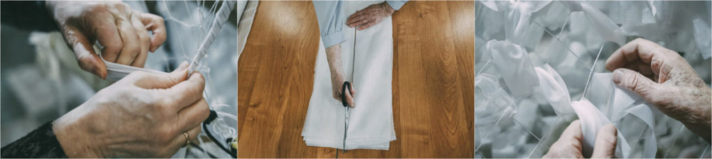 Она вплетает очередную полоску ткани белого цвета в сеть и продолжает: