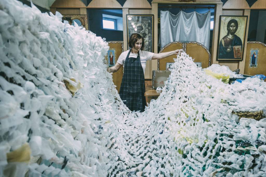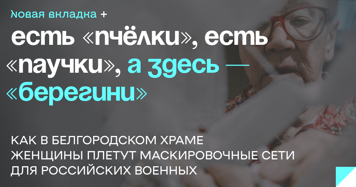Маскировочные сети плетут в православном храме на краю Белгорода. Двери небольшого светло-зелёного здания открыты нараспашку. У входа ждёт старшая по мастерской Наталья — женщина средних лет в рабочем фартуке и с тёмными волосами, собранными в хвост.