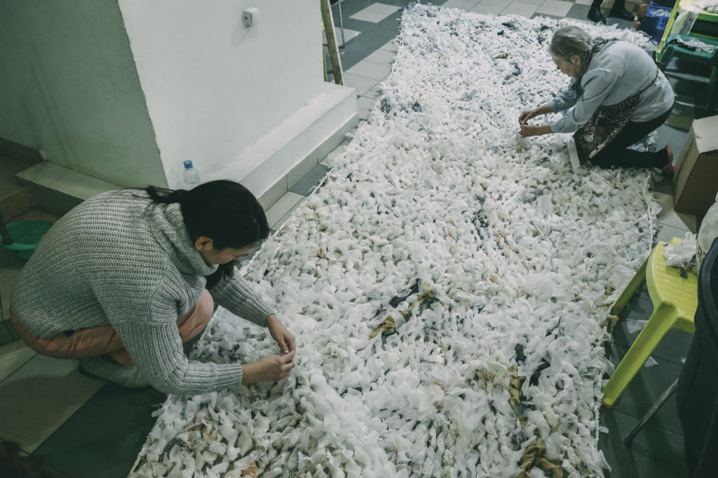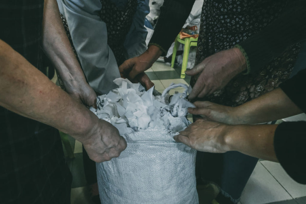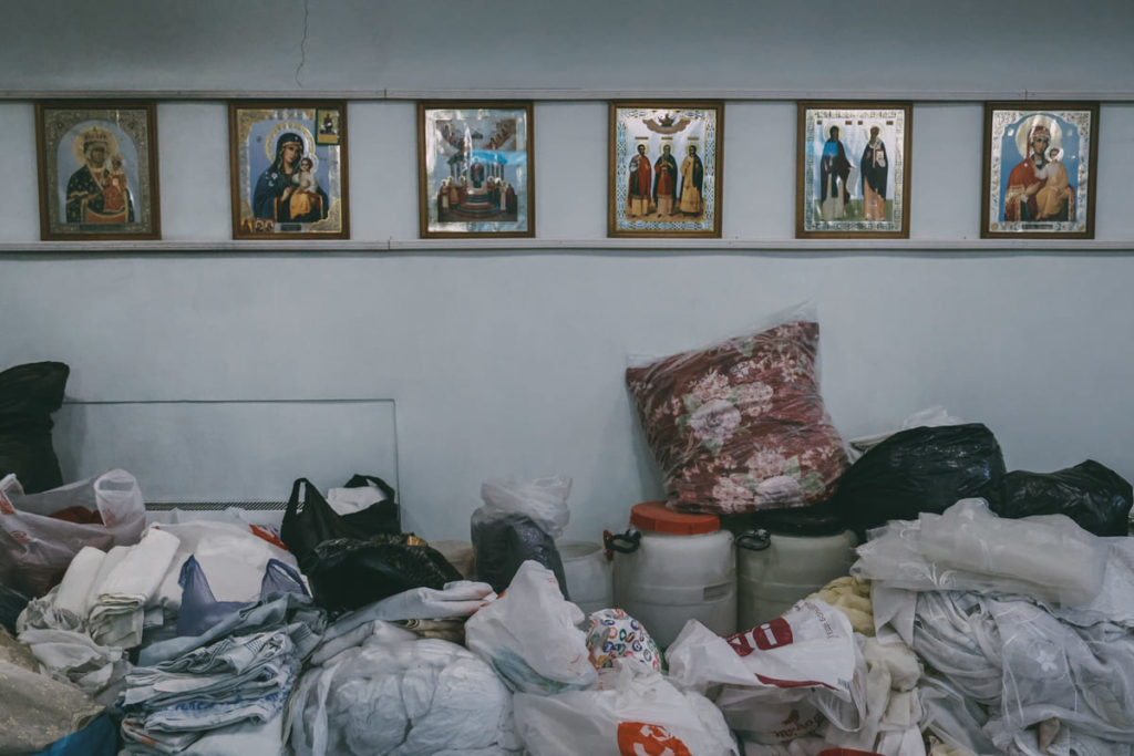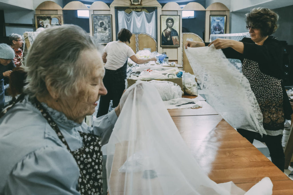 В пять часов вечера мастерицы расходятся, потому что работникам храма нужно закрыть трапезную. В комнате остаются незаконченные сети и пакеты с нарезанной тканью. Завтра женщины вернутся и продолжат работу.