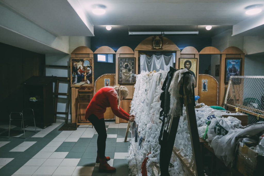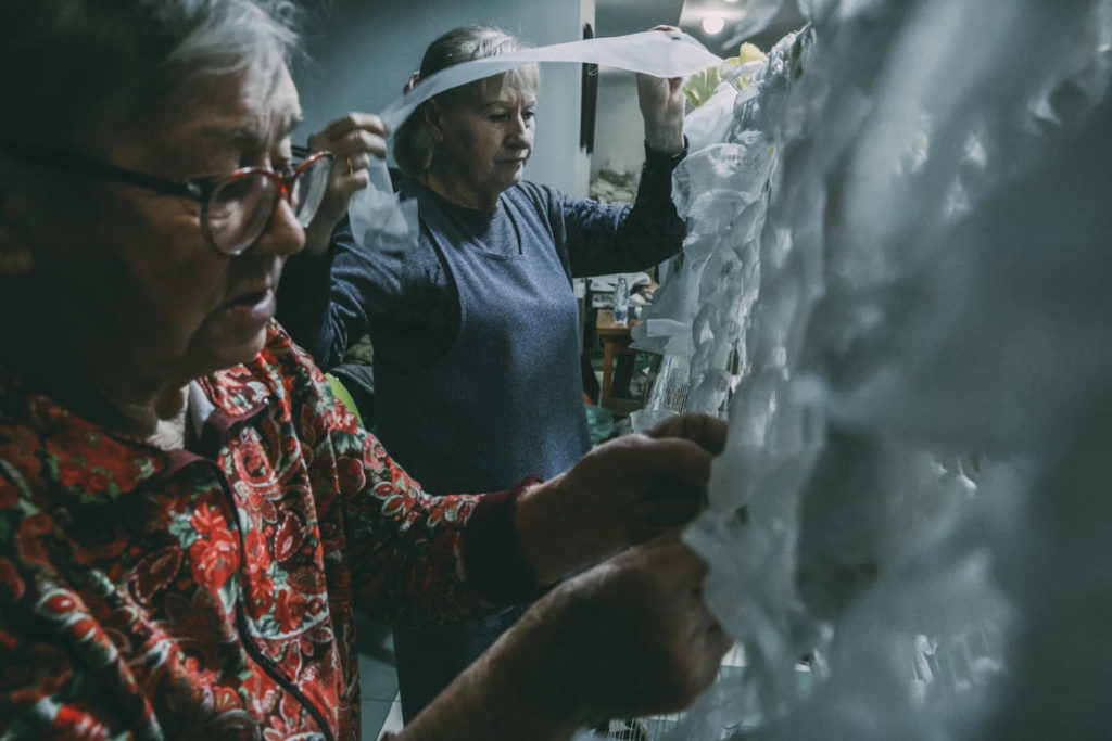 Женщина говорит: когда помогаешь военным, становится «гораздо проще». Поэтому здесь «все помогают, чем могут»: кто-то шерсть приносит, из которой бабушки потом вяжут солдатам носки, кто-то режет на сети свои свадебные платья. «А кто-то даже трусики раскраивает!», — не без гордости рассказывает Елена.