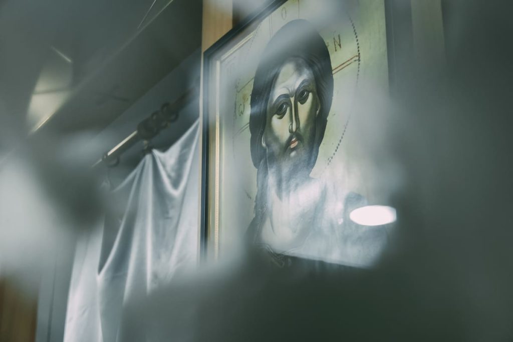Мы проходим в небольшую тёмную комнату с книжными стеллажами, заставленными церковными книгами. Следующая комната, трапезная, гораздо больше предыдущей. Всё пространство залито ярким жёлтым светом, по стенам развешаны иконы, большинство — с изображением Богородицы, держащей на руках Иисуса. Два длинных обеденных стола посреди комнаты завалены пакетами с тканями.