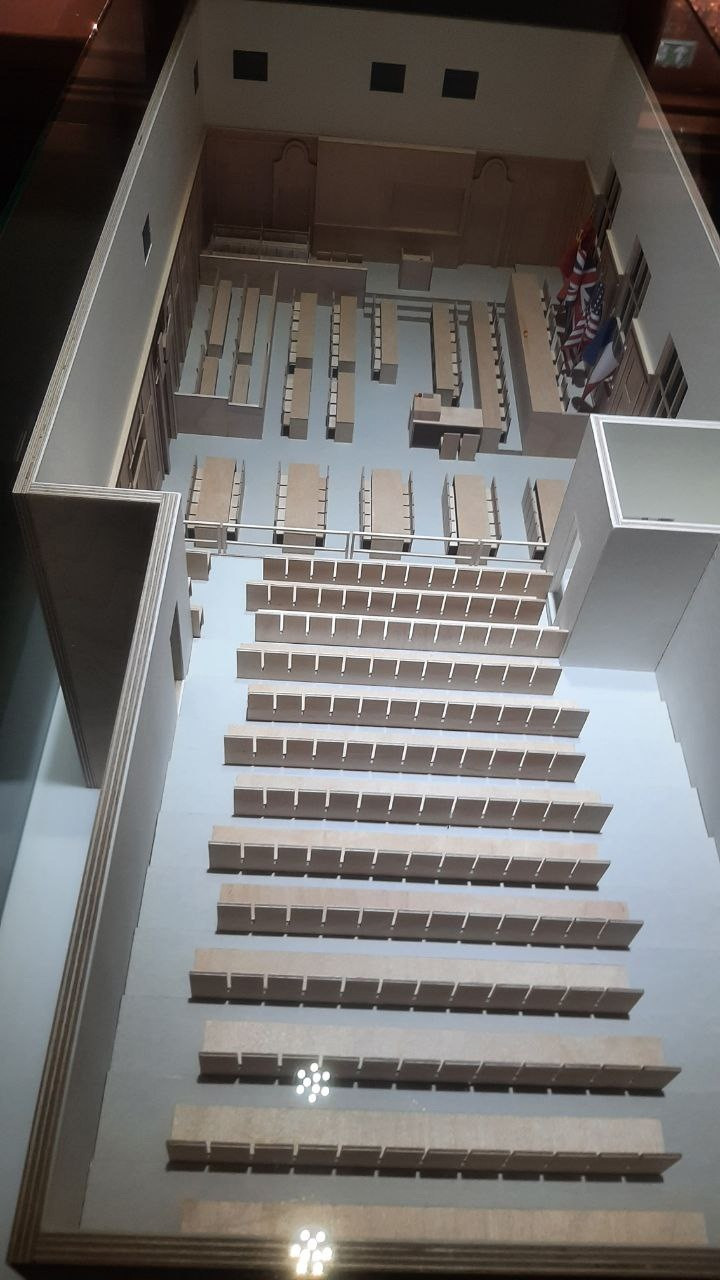 Сидя на лавке за ограждением, трудно уловить ту самую атмосферу, когда в этой коробке теснились судьи, обвинители, адвокаты, журналисты, свидетели, деятели фашизма, потому что помещение было перестроено для удобства современных судебных процессов. Теперь судейская трибуна возвышается прямо напротив входа, а столы стоят свободно. Мой аудиогид рассказал мне, что на месте четырех маленьких окон раньше специально снесли стену, чтобы разместить журналистов для наблюдения за Нюрнбергским процессом. Теперь же можно подняться в музей на этаж выше и через эти окна заглянуть в зал. Рядом стоит макет, который как раз и отображает, что во время суда там было очень тесно, стояло намного больше мебели и шестеренки машины международной бюрократии вертелись в каждом углу.