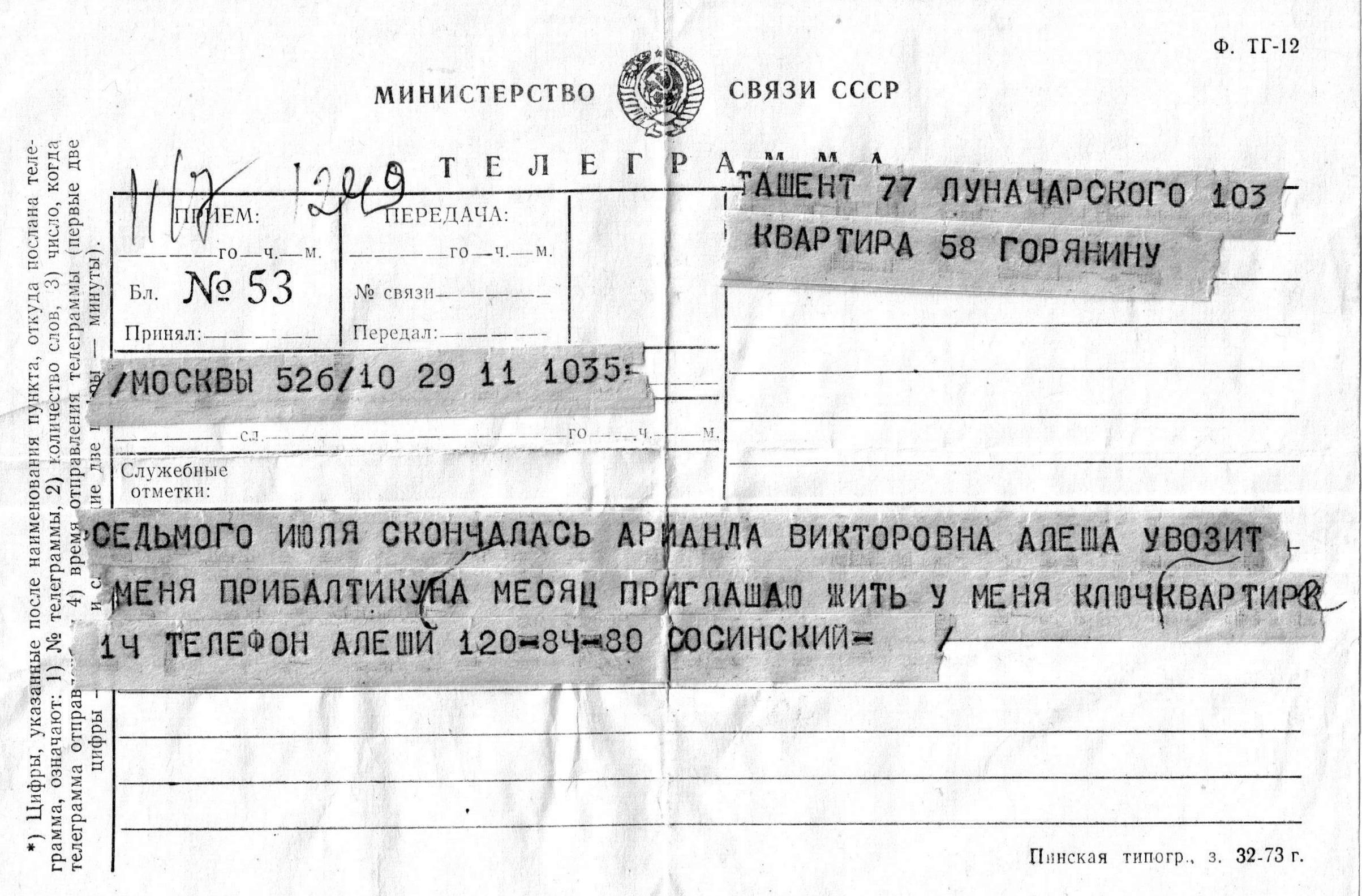 Для нас не навестить супругов Сосинских (уже на Ленинском проспекте 144) в любой из своих поездок в Москву было немыслимо. Но летом 74-го мы стали "долгоиграющими" гостями. Мы уже договорились было провести месяц в подмосковном Дедовске, однако все поменяла телеграмма: "СЕДЬМОГО ИЮЛЯ СКОНЧАЛАСЬ АРИАДНА ВИКТОРОВНА АЛЕША УВОЗИТ МЕНЯ ПРИБАЛТИКУ НА МЕСЯЦ ПРИГЛАШАЮ ЖИТЬ У МЕНЯ КЛЮЧ КВАРТИРЕ 14 ТЕЛЕФОН АЛЕШИ [такой-то] СОСИНСКИЙ". Позаботиться о друзьях даже в такой момент – в этом был весь Брониславыч. Мы, конечно, не стали отказываться.