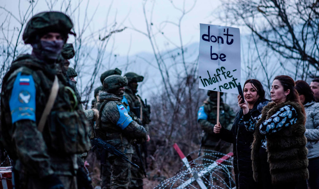 Протестующие стоят перед российскими миротворцами на дороге под Степанакертом. Фото: Davit Ghahramanyan / AFP / Scanpix